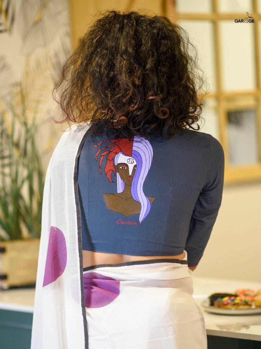 Su, the model is wearing size S blouse and the saree is Floating Stars in the Galaxy Polka.