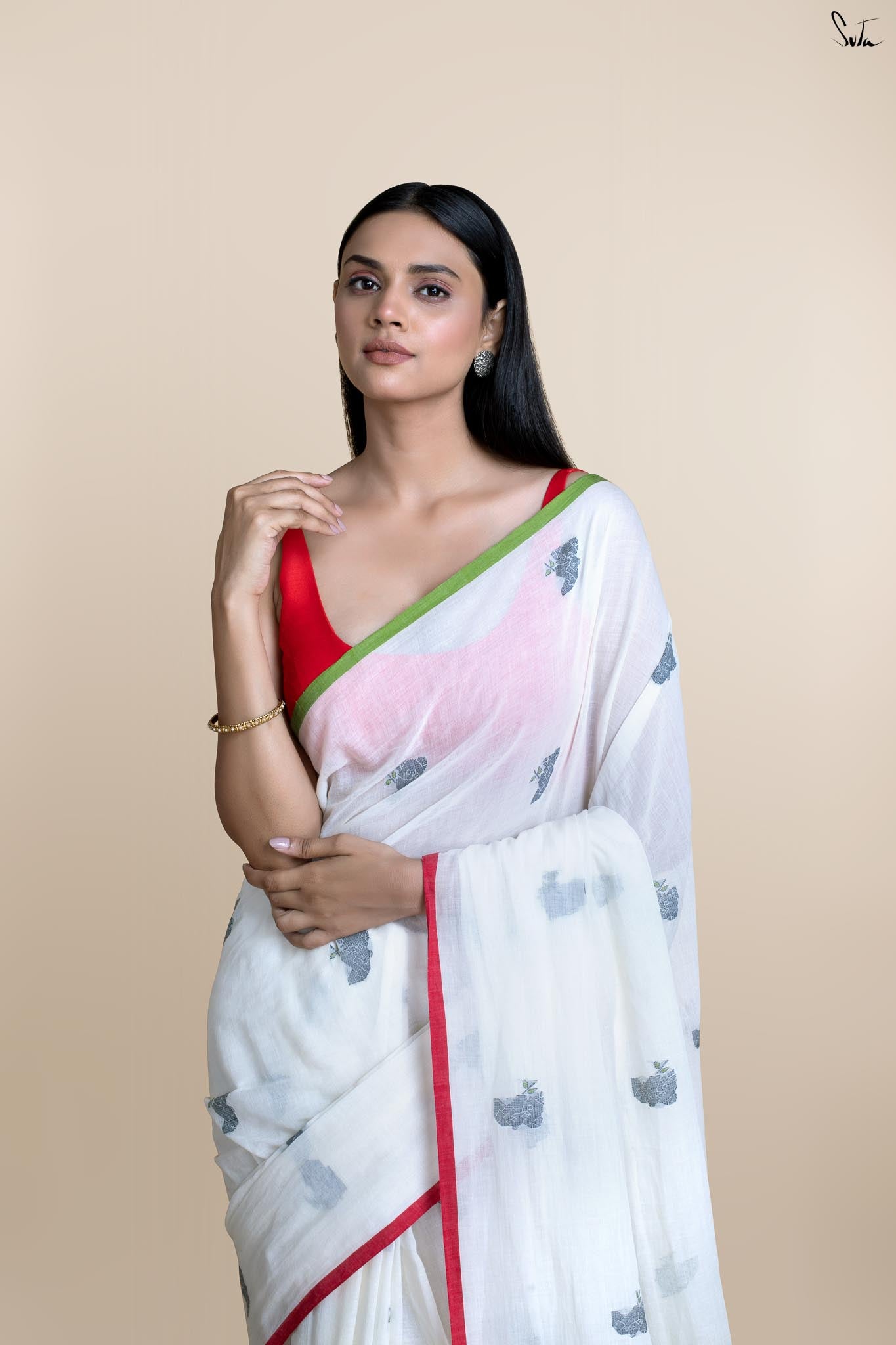 Suta Women White Ethnic Motifs Motif Printed Cotton Saree