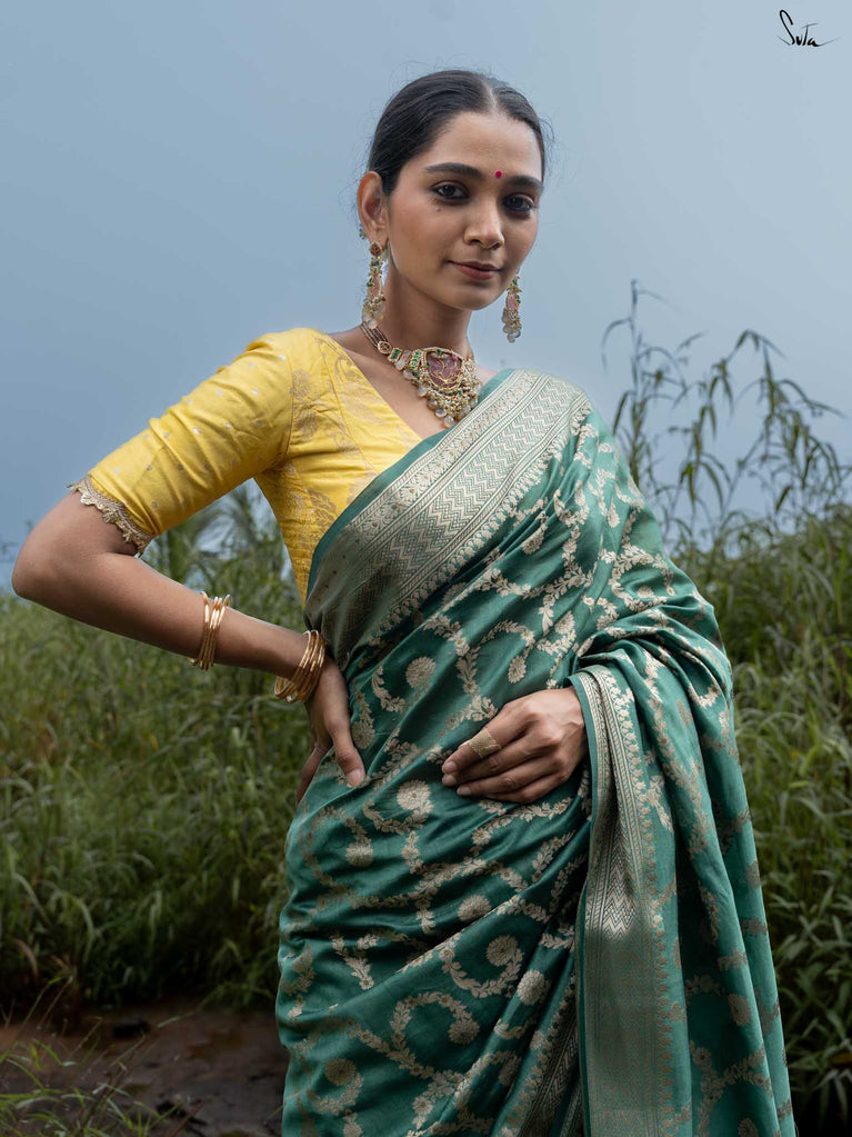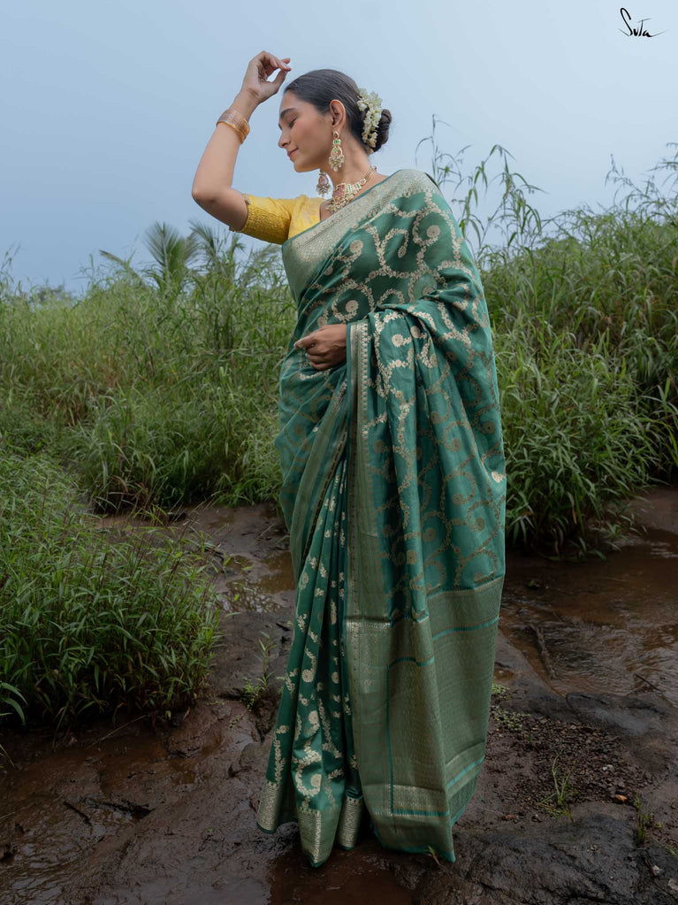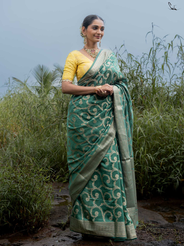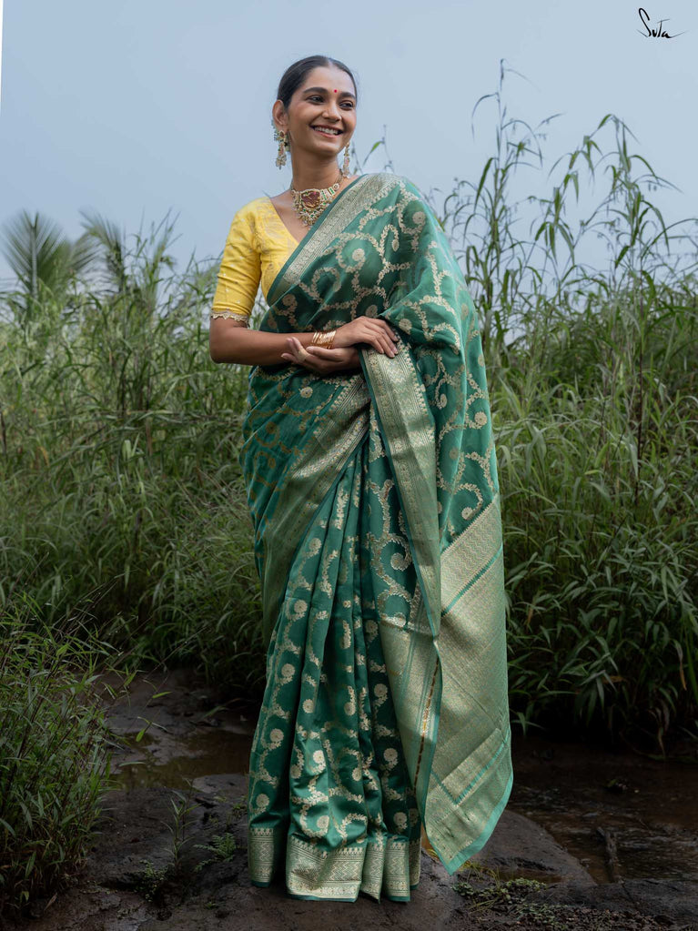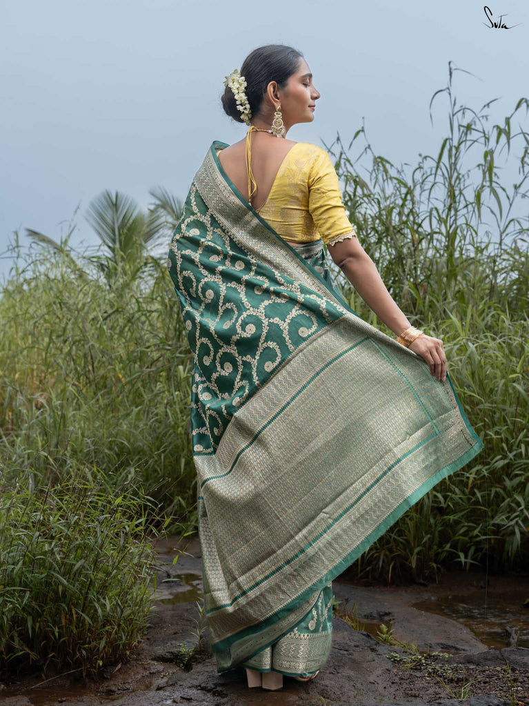 Bold yet beautifully balanced, Tivra mirrors the deep rhythm of nature. Its dark green cotton-silk base is brought to life with a delicate dull gold floral jaal - a dance of light and depth. Featherlight to drape yet rich in detail, this saree brings quiet sophistication to every festive moment.