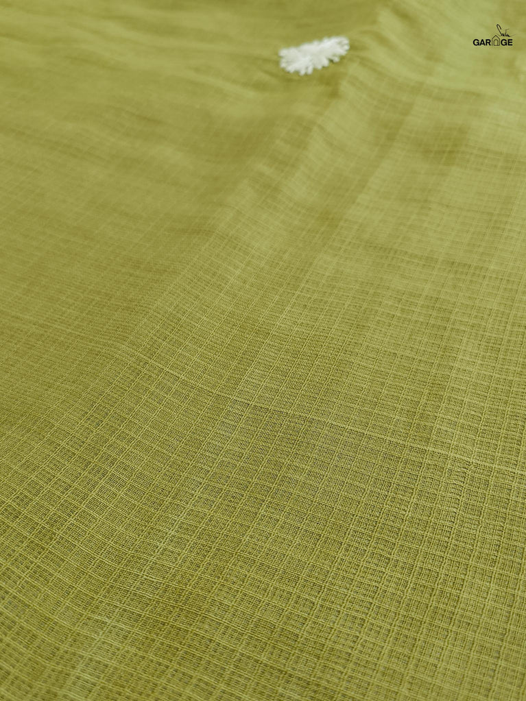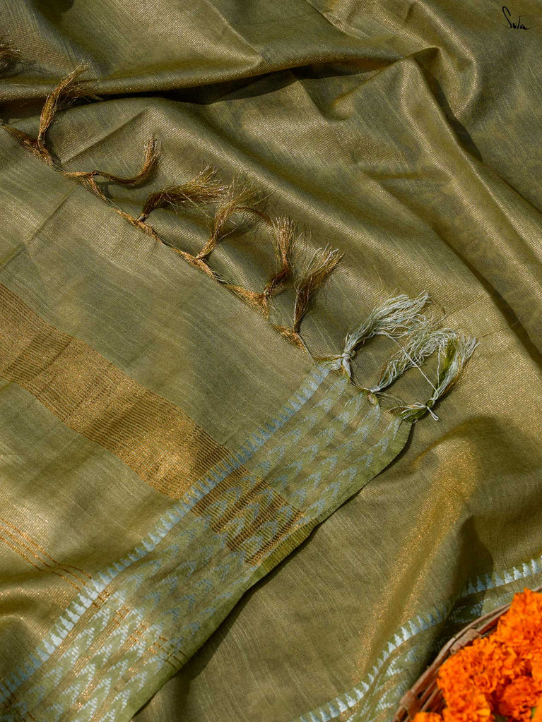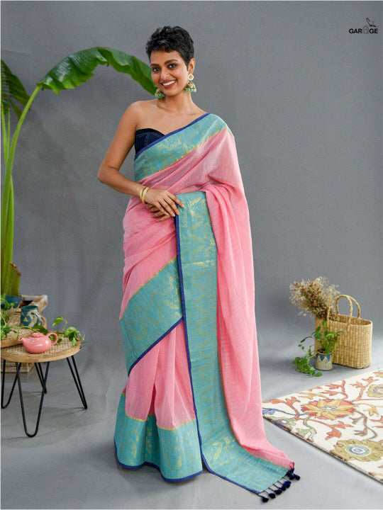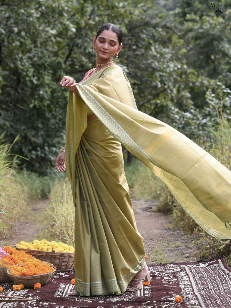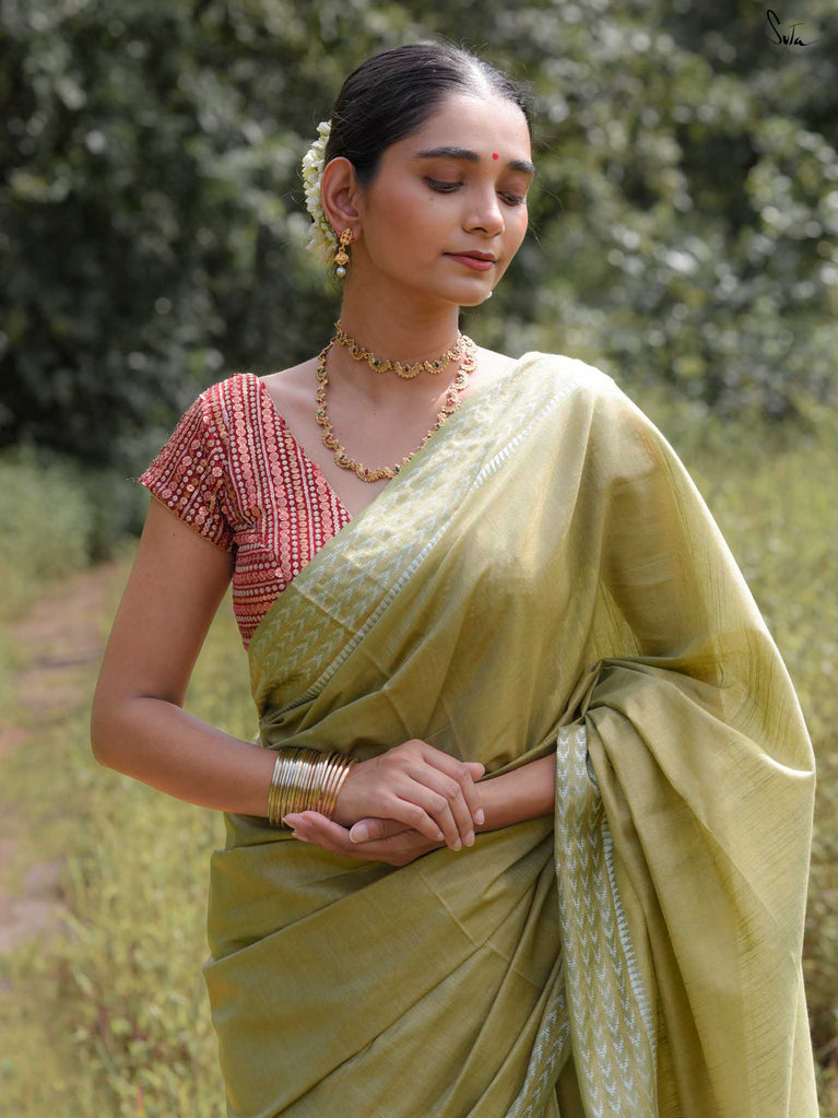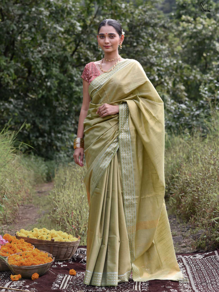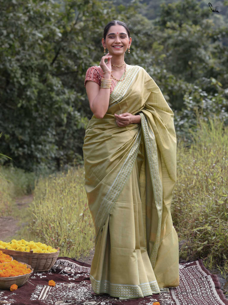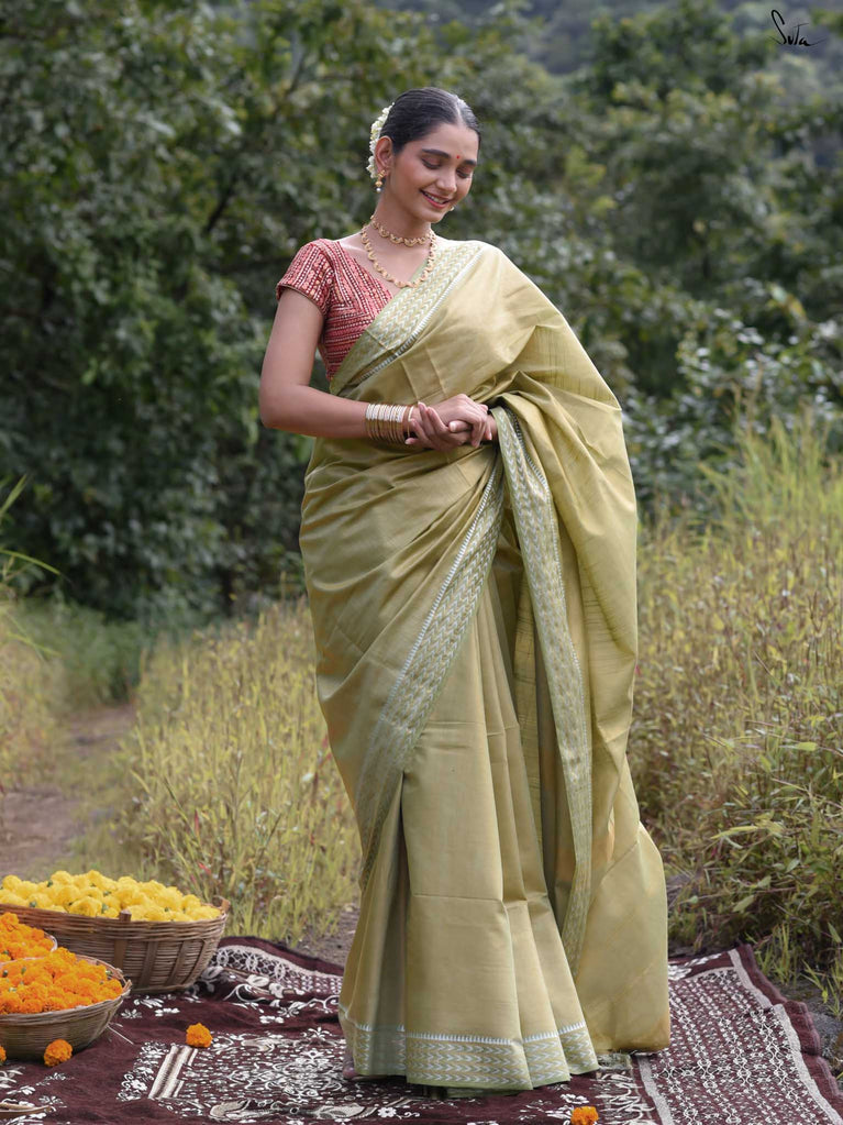 An olive green saree that feels grounded and graceful. The colour carries a sense of calm confidence and earthy charm. The geometric dobby border adds definition and style, keeping the look elegant and festive. Perfect for celebrations that call for subtle sophistication. Comes with a matching blouse piece, no fall.