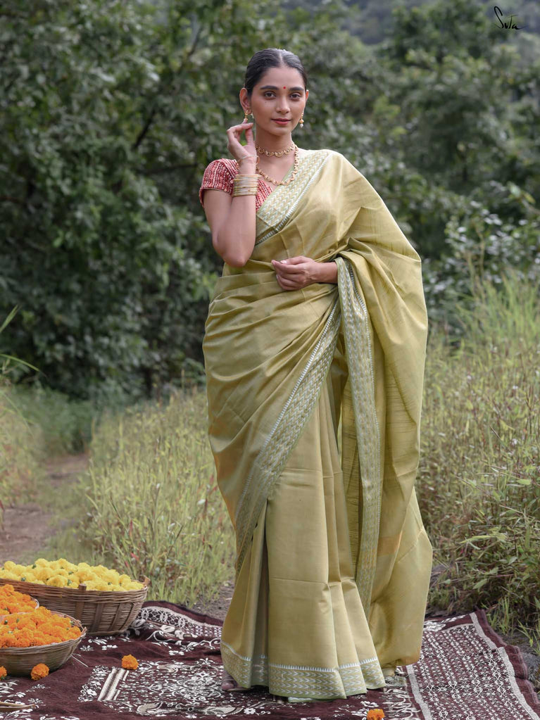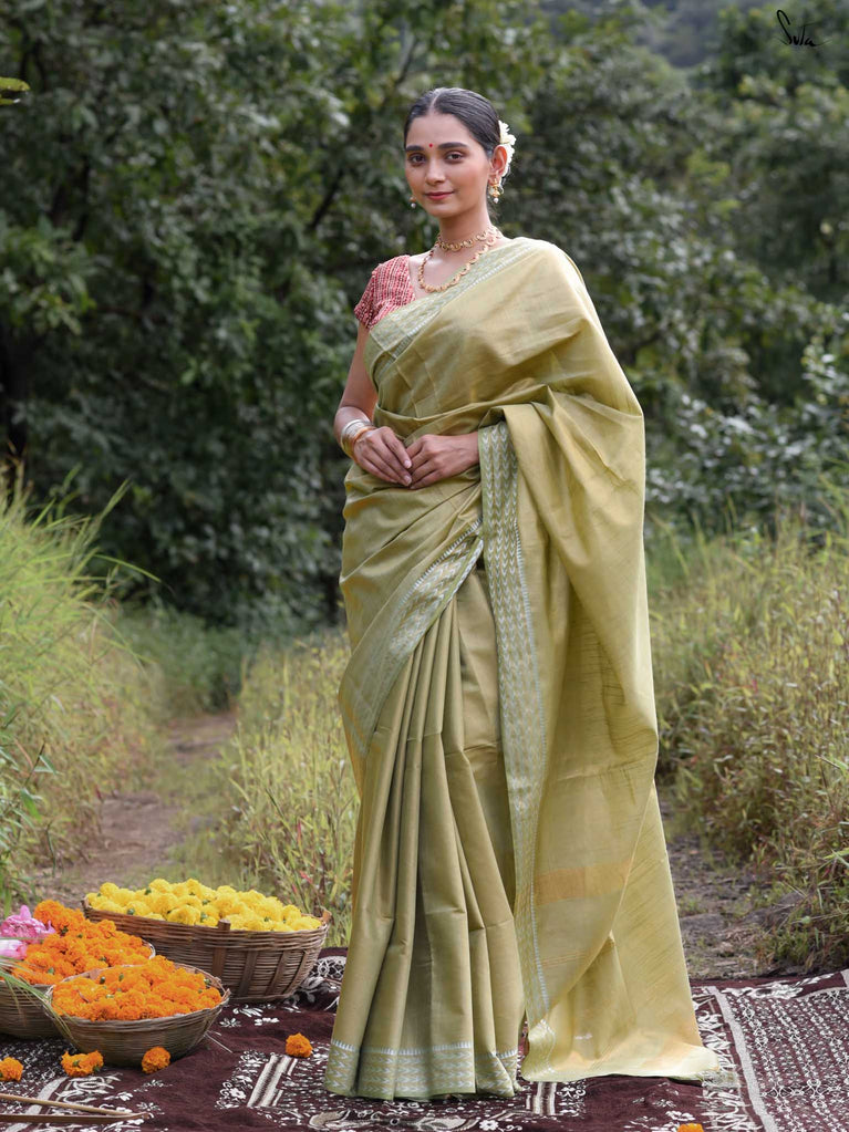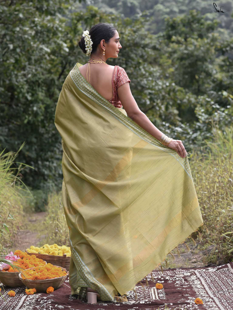 Vibrant, fearless, and full of joy - Swarangi is a celebration in motion. Woven in striking neon green cotton-silk, it’s brought to life with a soft dull gold floral jaal that adds just the right touch of elegance. Light, playful, and unapologetically bright - this saree is made to turn ordinary days into festive memories.
