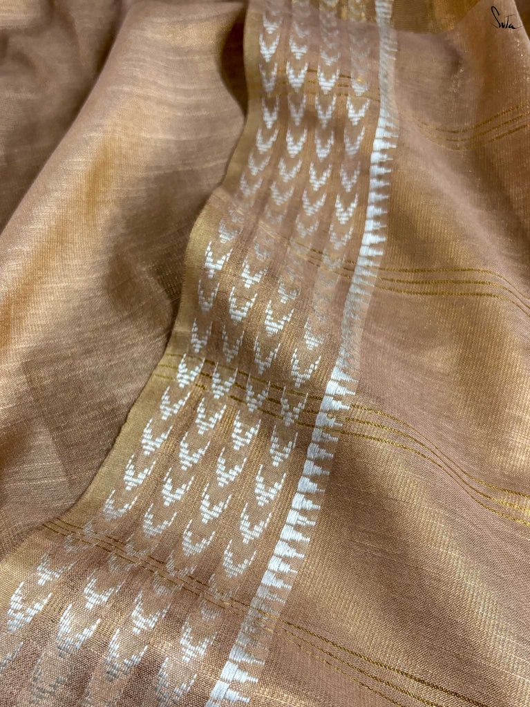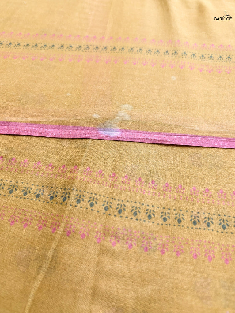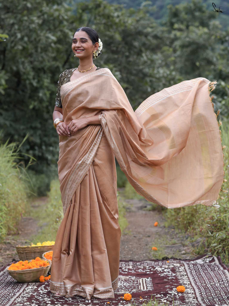 Warm as the first sun after winter, Chaiti captures the soul of celebration in its rust-toned weave. Crafted in airy cotton-silk, it features a dull gold floral jaal that glows softly - never loud, always luminous. Lightweight, elegant, and full of heart, this saree is made for those golden-hour moments that linger long after they’re gone.