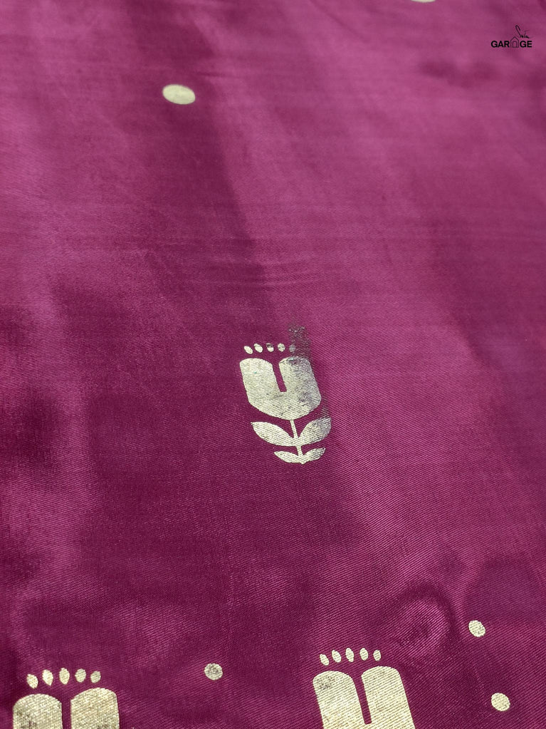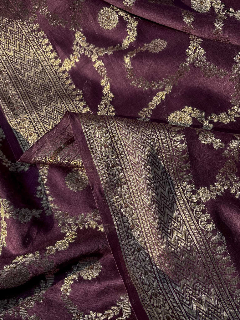 Like the melody it’s named after, Thumri flows with quiet grace and deep emotion. Draped in a rich wine hue, this cotton-silk saree carries an intricate floral jaal woven in soft, dull gold - a gentle nod to timeless opulence. Light as a whisper yet regal in presence, it’s perfect for moments that call for understated celebration.