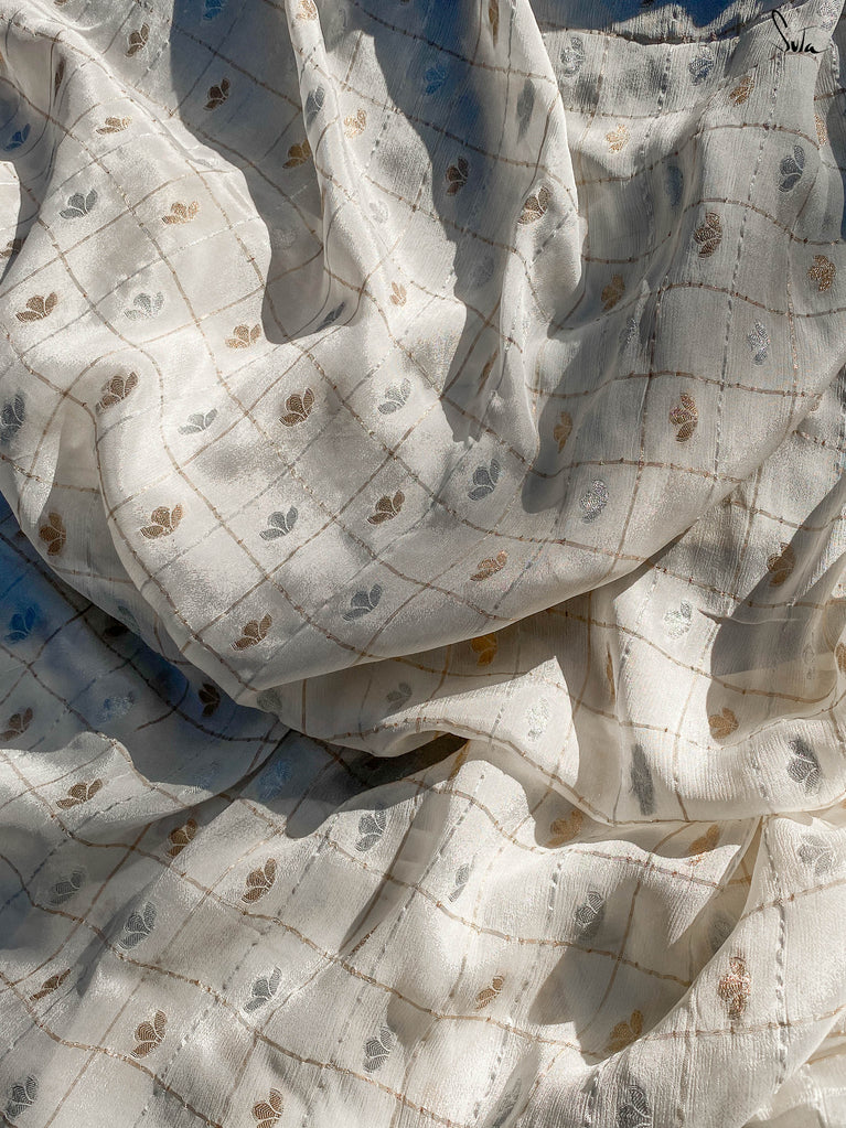 Dharani, a soulful saree made from delicate mul cotton, features a white and gold color scheme with a plain gold border that adds a touch of luxury. Adjustable loops, a small pocket, and matching lining ensure a perfect drape, making it ideal for any occasion in under 30 seconds.