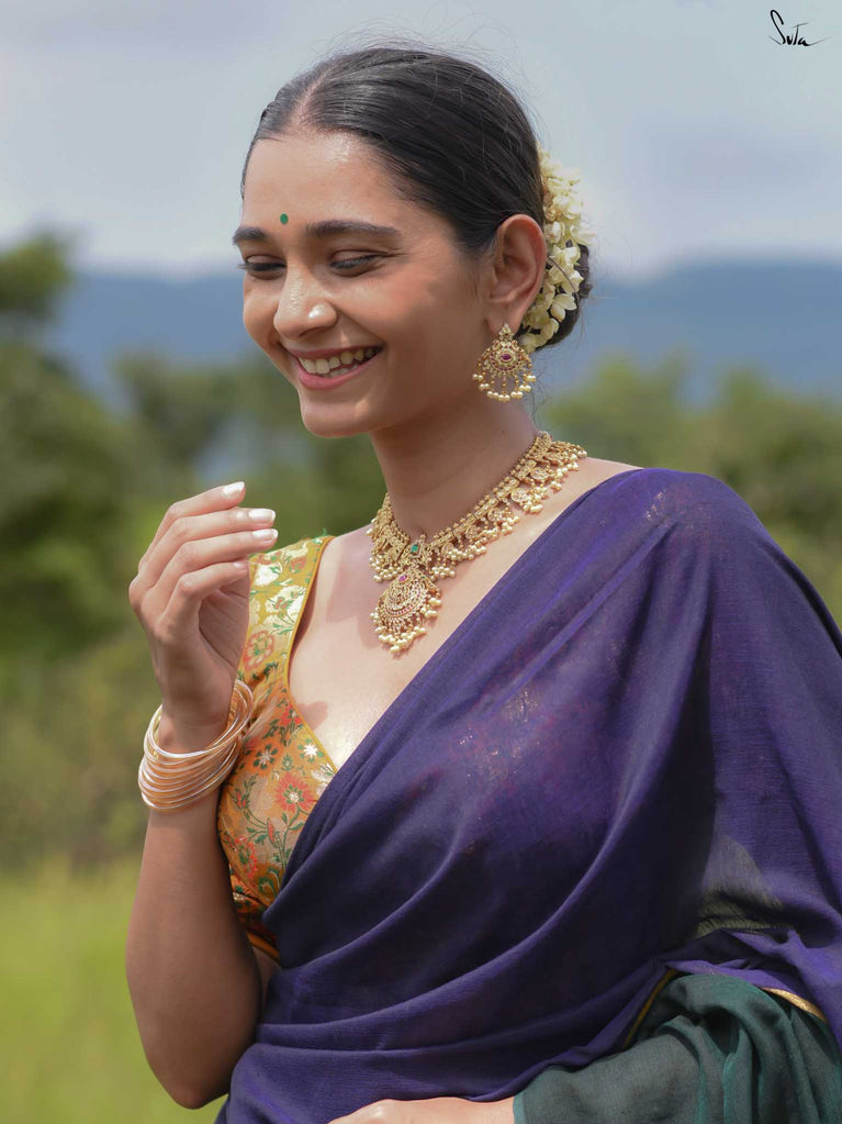 True to her name, Bondona wove this cotton-acrylic saree with prayerful attention to every detail. The rich purple body shimmers with allover gold zari floral motifs, finished with a solid gold pallu and matching tassels.
