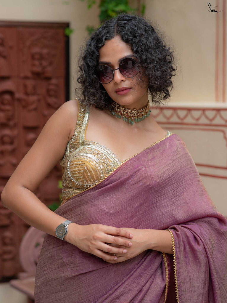 Soft never looked this stunning. This mauve crushed viscose saree carries a hush of romance with a streak of fire. The contrast tassels and gota border add to this personality.
