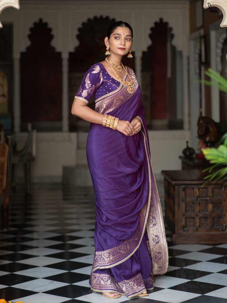 Turn heads at every evening celebration with Cocktail Hai, a regal purple viscose saree. Its smooth woven solid base is enhanced with delicate embroidered lace & brocade borders, creating a look that’s perfect for cocktail parties, wedding receptions, Cocktail evenings, and festive gatherings.A saree that balances sophistication with a hint of playfulness, ideal for celebrations where style meets elegance.