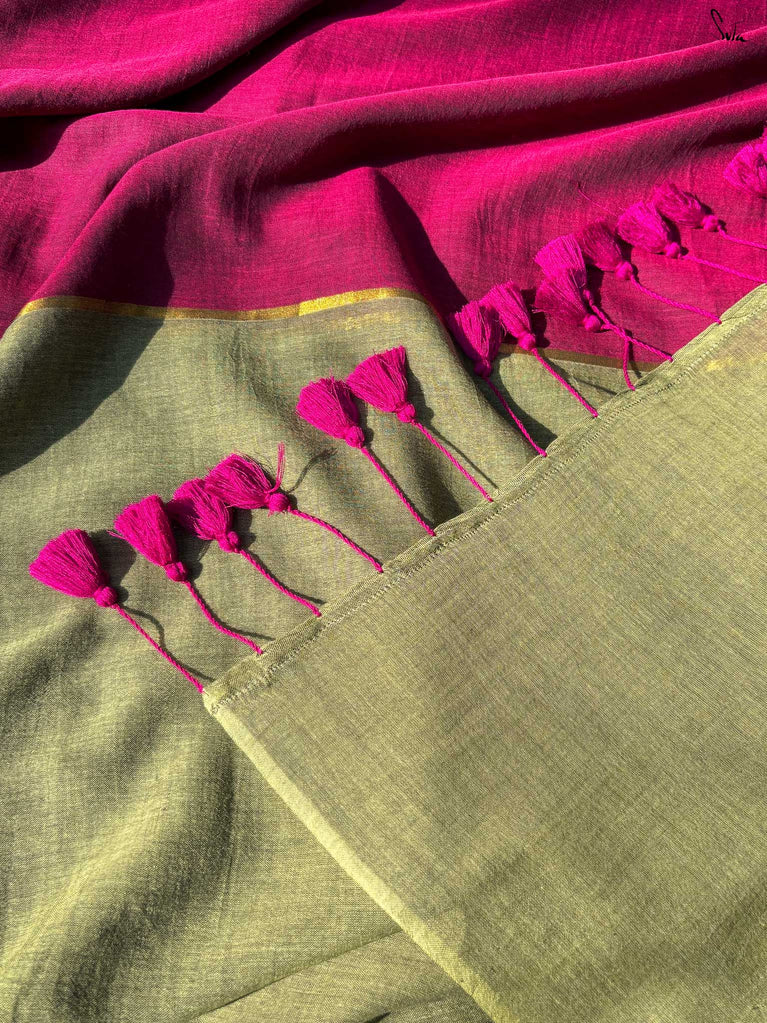 Bright, breezy, and beautifully balanced Dipped in Hibiscus captures the joy of festivity in a mul cotton weave. The saree features a striking half-and-half combination of pink and green, divided by a subtle zari stripe that adds a glimmer of celebration. Lightweight, soft, and gracefully woven, it’s perfect for festive days, intimate gatherings, or as an everyday