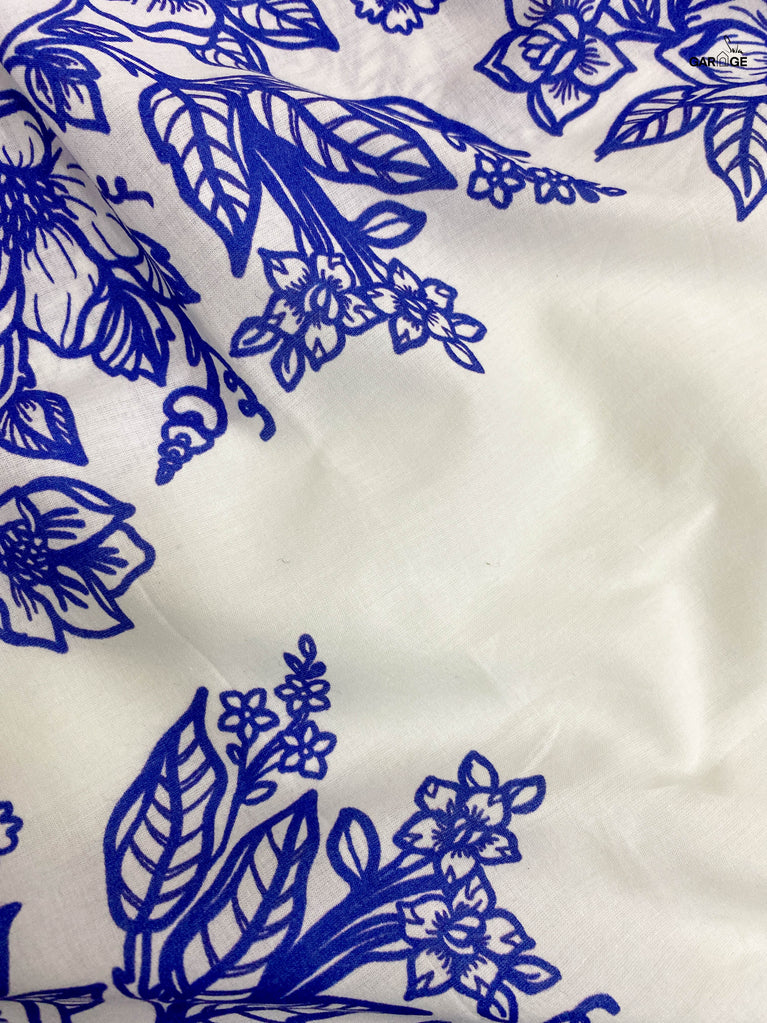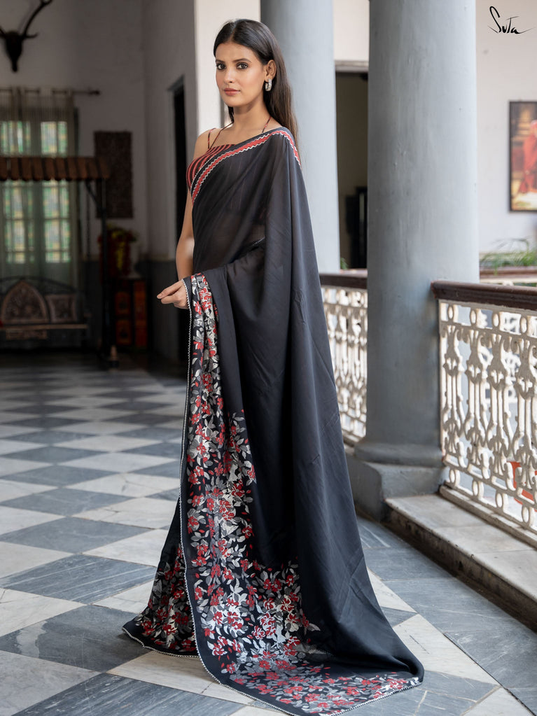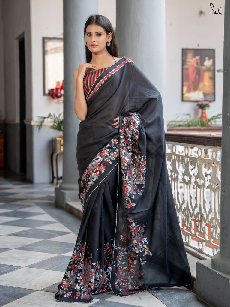 A captivating print featuring a vibrant array of flowers enriches the saree and adds a hint of subtle shimmer featuring delicate foil prints along the border. Tone-on-tone stripes on the body of the saree is an absolute visual treat.