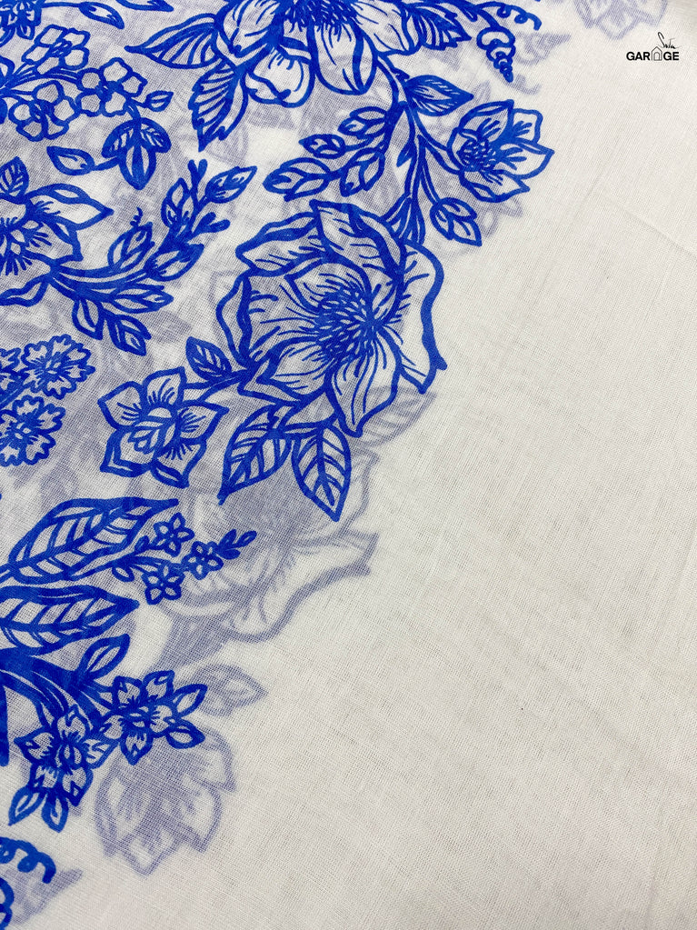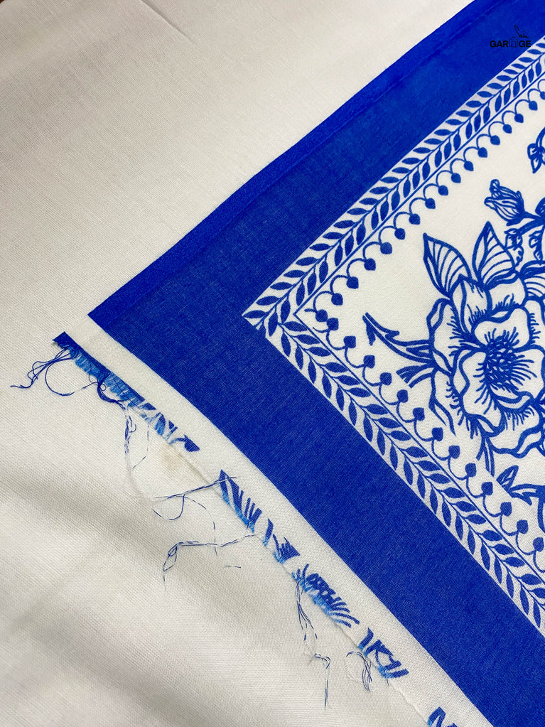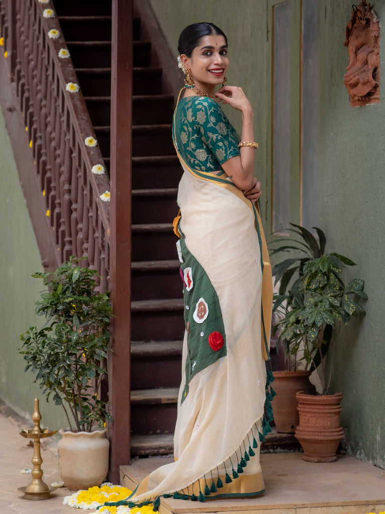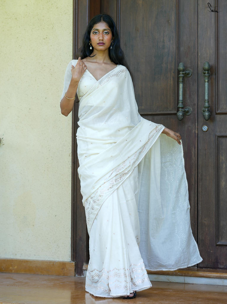 Arali is crafted from a cotton viscose blend, embodying the essence of a flower garden. This off-white saree drapes beautifully and a classic gold zari border adds a touch of regal opulence.