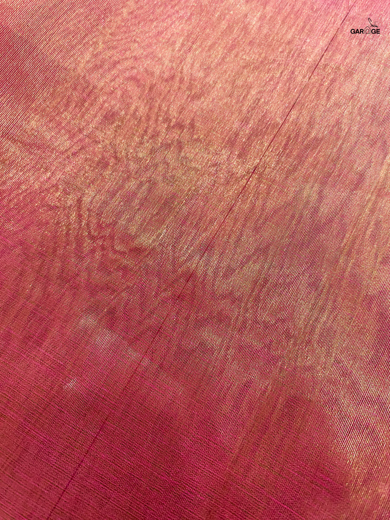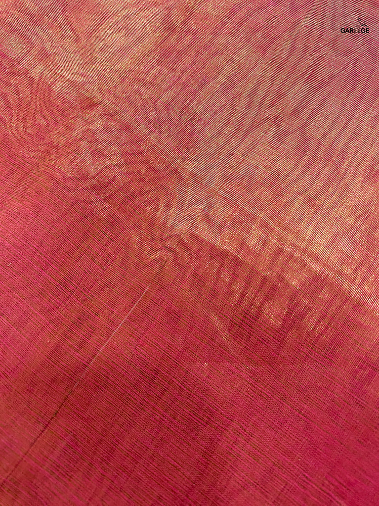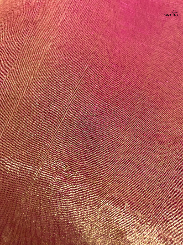 This saree has been handwoven by a master weaver in the Mashru tradition. The Mashru weave is said to have originated in West Asia, in the 19th Century. The fabric is woven with a silk weft and a fine cotton warp. It thus combines the ageless comfort of cotton and the timeless aesthetic of silk, elevated by the presence of gold and silver zari.