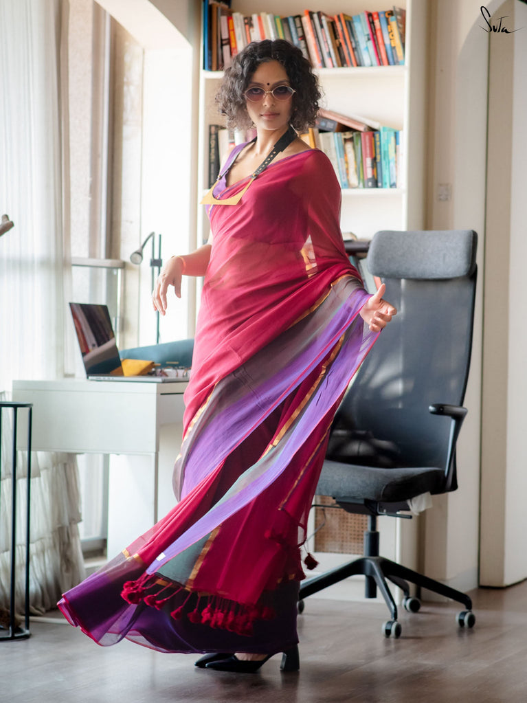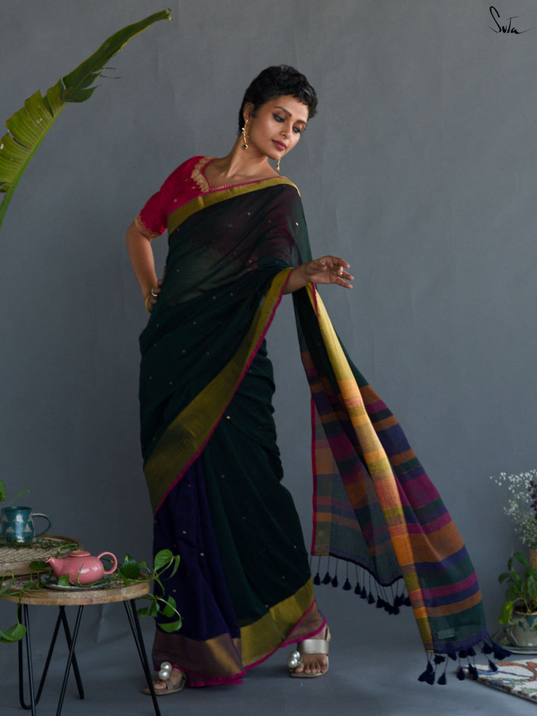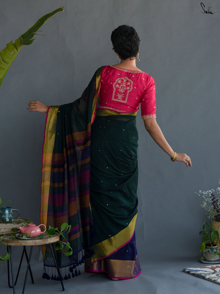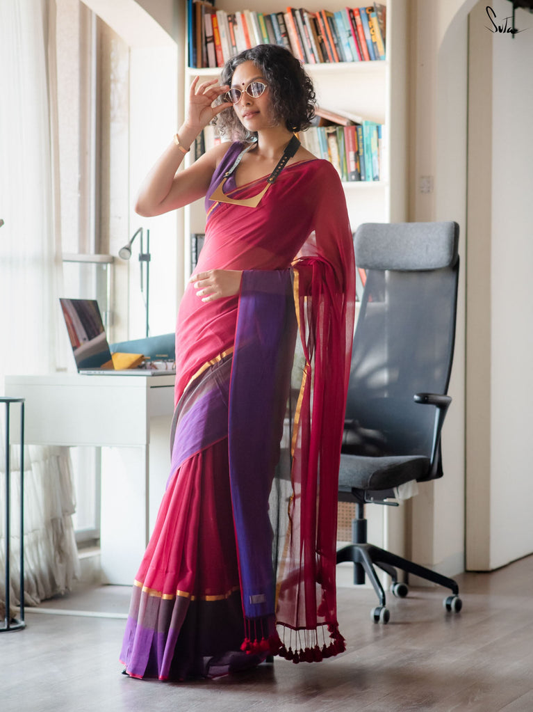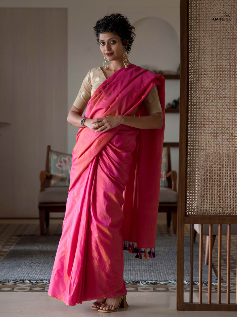 A pink and orange striped cotton saree that radiates warmth and playfulness, finished with a contrast green jacquard border that makes the whole piece pop. What makes it precious is its easy versatility — light enough for everyday wear yet striking enough to turn heads on festive mornings. It’s that saree you’ll keep reaching for when you want effortless charm with a dash of boldness.