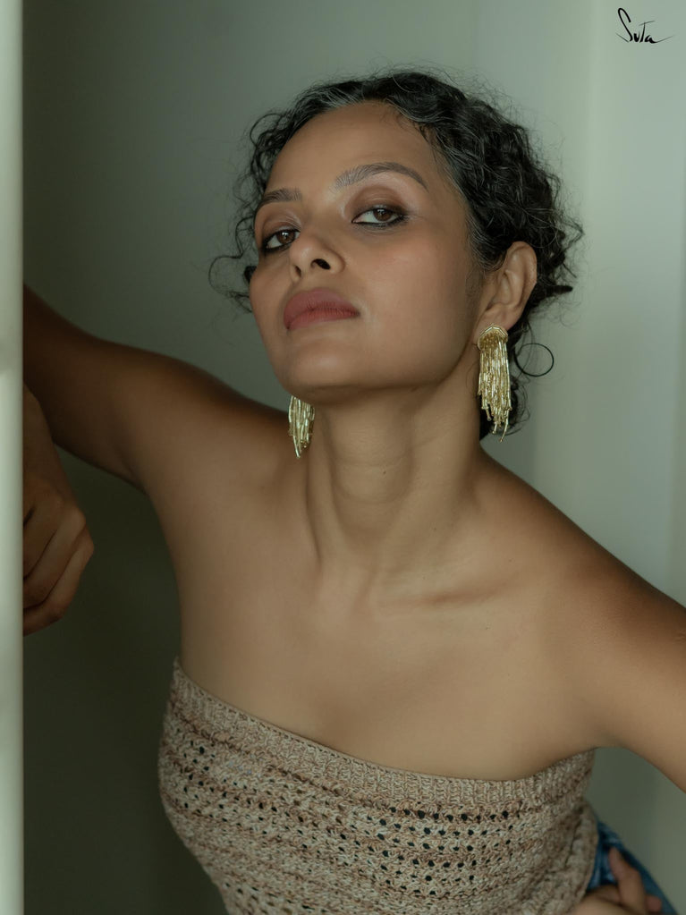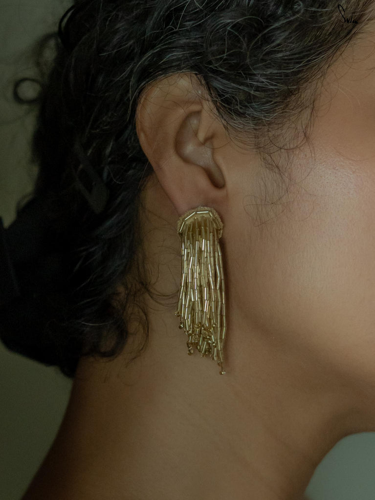 Give your fashion lookbook a golden compliment with the Gold Sparklers earrings. Handcrafted in a striking golden hue and featuring hand-embroidered zardozi thread work, these earrings bring in festive vibes even in the most formal outings.