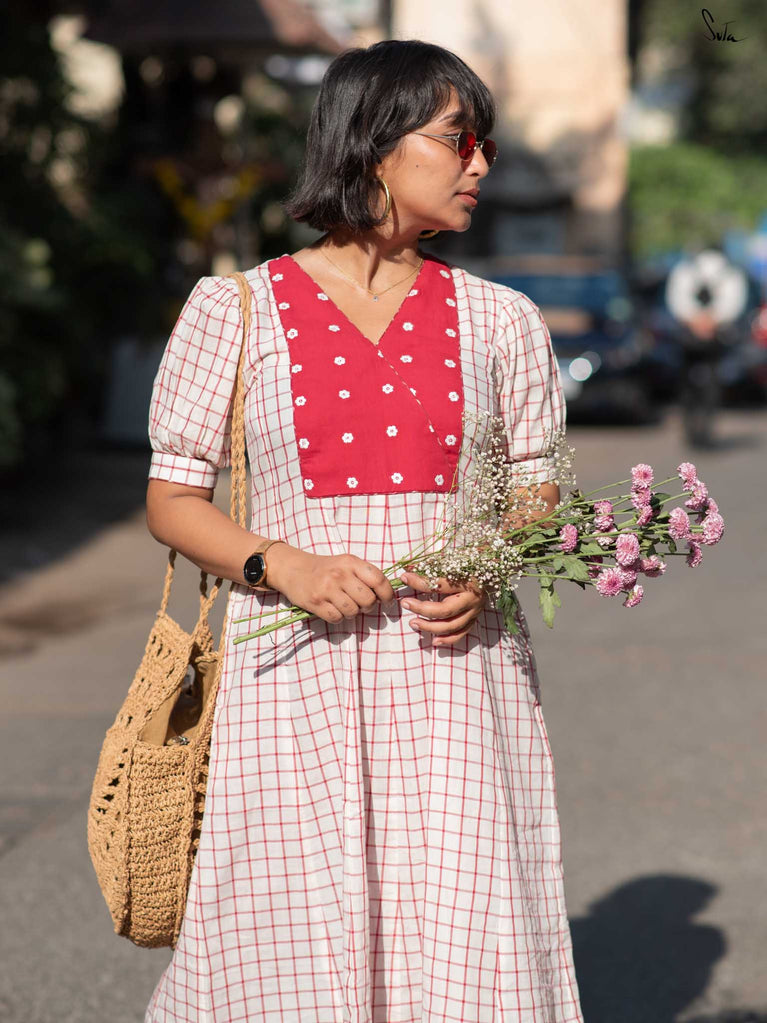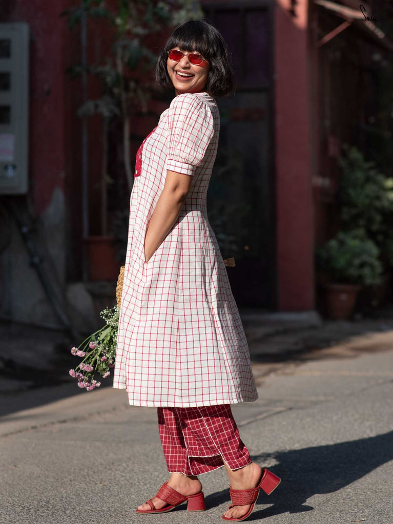 A gentle contrast, soft and striking all at once. This white checkered kurta set floats like a daydream, with a maroon yoke embroidered in florals adding quiet depth. Puff sleeves and a V-neckline bring structure, while contrast piping adds a refined touch. The matching pants offer a slit at the hem and contrast piping, allowing ease with every step.