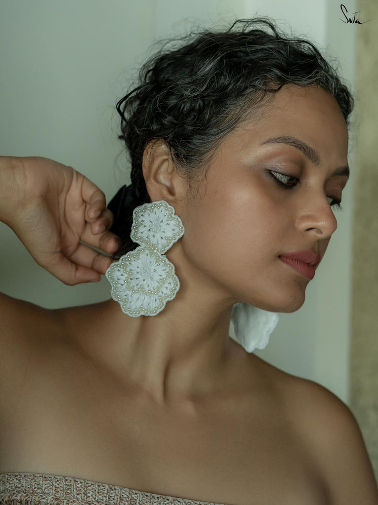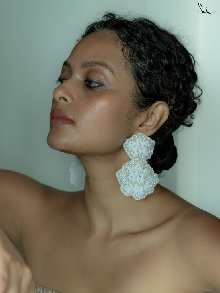 Explore the richness of elegant fashion with the Aristocrat Ear Ring, a statement piece that is handcrafted with a pristine white shade. These floral earrings also contain zardosi threadwork and hand embroidery, painting every look with a stroke of elegance and purity.