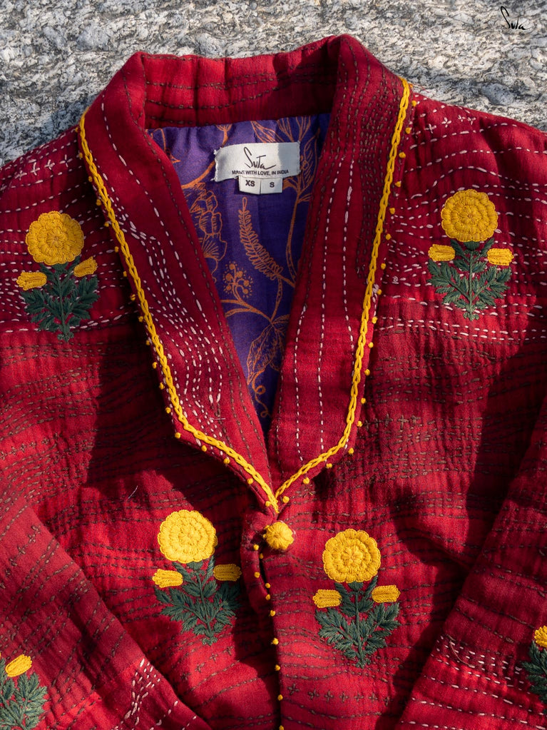 Anisa, like every jacket in the Bageecha collection, is crafted with an incredible amount of time, effort, and heart. The jacket is a stunning mix of red hues, brought to life through careful quilting and traditional Katha running stitches. The vibrant yellow marigold flowers embroidered on the jacket embody the artisans' love for nature and their craft, each stitch meticulously placed. From the careful French knots adorning the cuffs and hem to the yellow chain stitch that traces the collar, every detail tells a story of dedication and attention. The artisans’ hands move with purpose, creating a masterpiece that is a labor of love from start to finish. Each piece passes through the hands of many skilled craftsmen, who imbue it with their love and stories, making it not just a jacket, but a symbol of the beauty and care that goes into every handcrafted garment.
