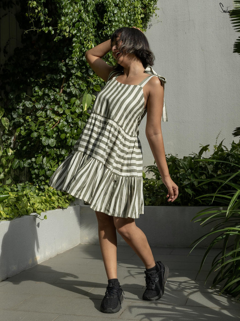 Float like a cloud in Air Weave, a short spaghetti dress in dreamy white and grey hues. The U-neckline and airy cotton fabric invite freedom of movement. Perfect for summer picnics or evening strolls. Pair the dress with ankle boots and let the breeze carry you.