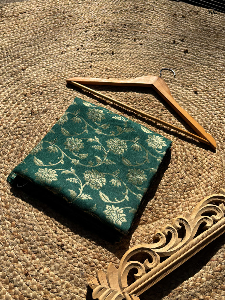 Chinar Pashm feels like autumn in Kashmir -soft, warm, and full of quiet beauty. Made from luxurious pashmina silk, this off-white saree is woven with bright, intricate patterns inspired by Chinar leaves in sunlight.Light yet rich, it blends heritage with modern elegance. Perfect for evenings when you want to look graceful without trying too hard -timeless, soulful, and simply stunning.