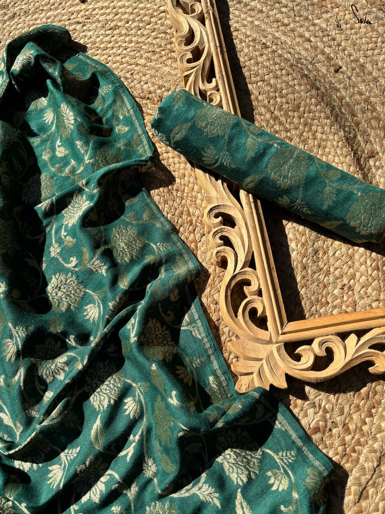 Apricot Pashm feels like apricot flowers opening under a twilight sky. Woven from a soft blend of pashmina wool and silk blend, it’s light, fluid, and effortless to wear.The deep blue base shines with colourful woven motifs, inspired by Kashmiri artistry and serene mountain evenings. Warm, elegant, and easy this saree blends tradition with modern charm.Made for the woman who seeks beauty in softness, Apricot Pashm brings strength wrapped in grace.