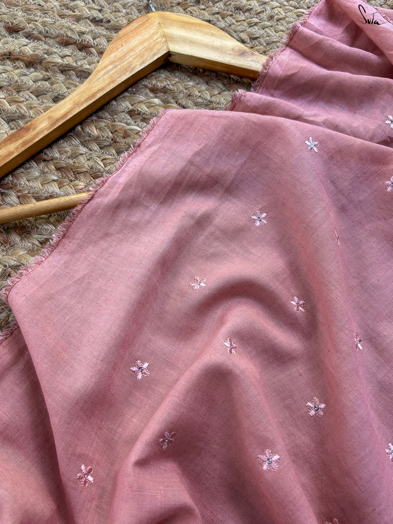 Soft as a secret and radiant as dawn - Asli Chaandi is pure poetry in pink. This sleeveless linen blouse gleams with intricate embroidery that catches the light beautifully, lending it a festive glow. The V neckline adds modern finesse, while the delicate hue keeps things romantic and versatile. Perfect for everything from haldi mornings to evening receptions, this blouse is the real deal - graceful, effortless, and unmistakably you.