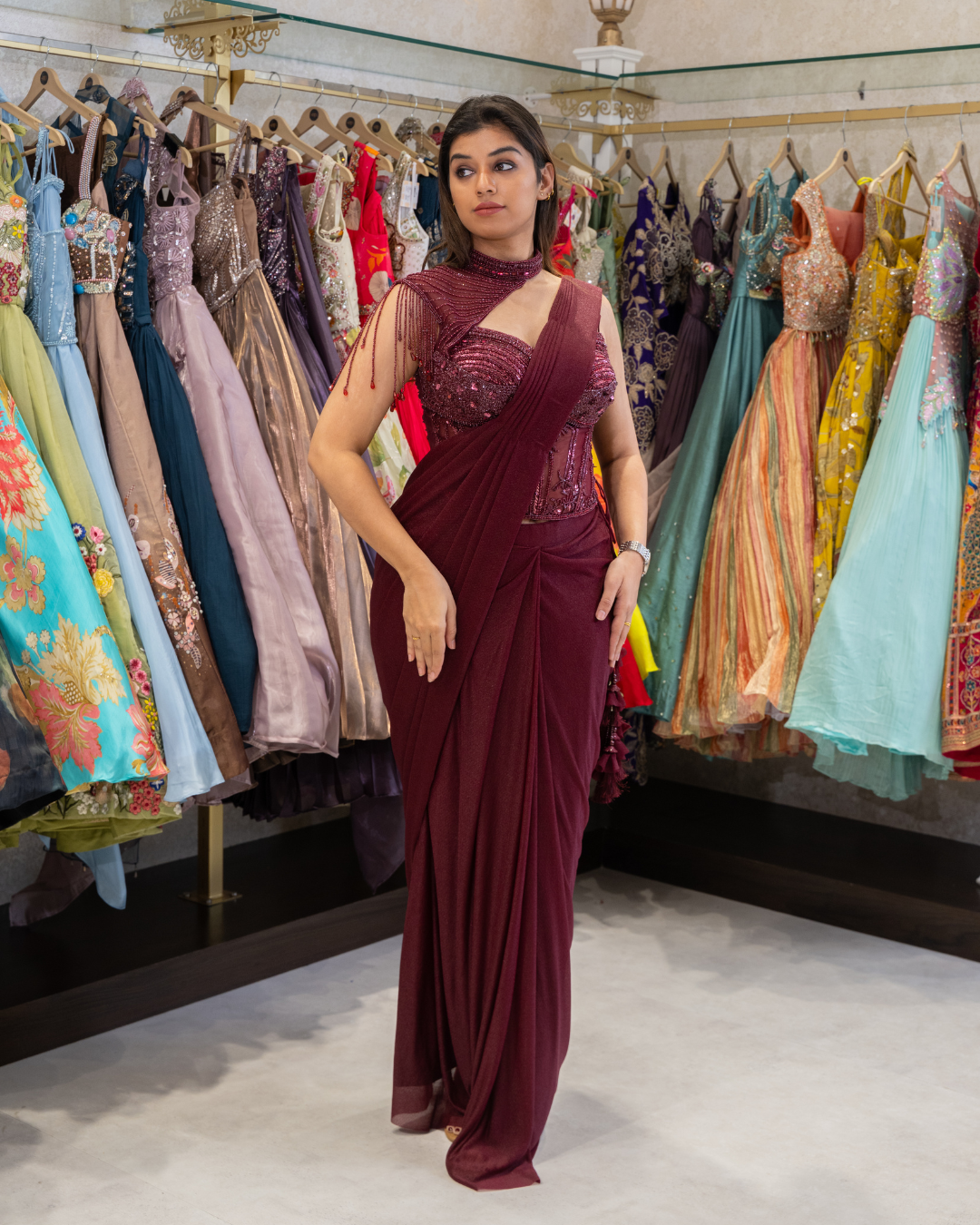 Crafted in elegant chinon fabric, this ensemble features a heavy blouse adorned with intricate moti and stone work in a self-color tone. Paired with a stylish matching cape, the outfit offers a refined and graceful look—perfect for festive occasions, cocktail nights, and contemporary celebrations.