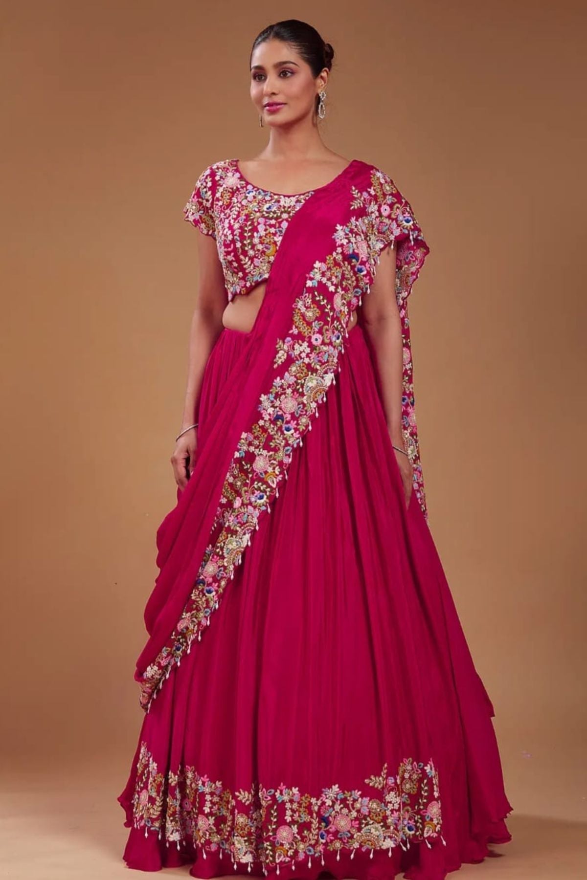 Step into style with Embroidered Elegance, a pink lehenga made from soft georgette and detailed with stunning multicolor embroidery. This outfit is a perfect choice for weddings, festive events, or any special day.