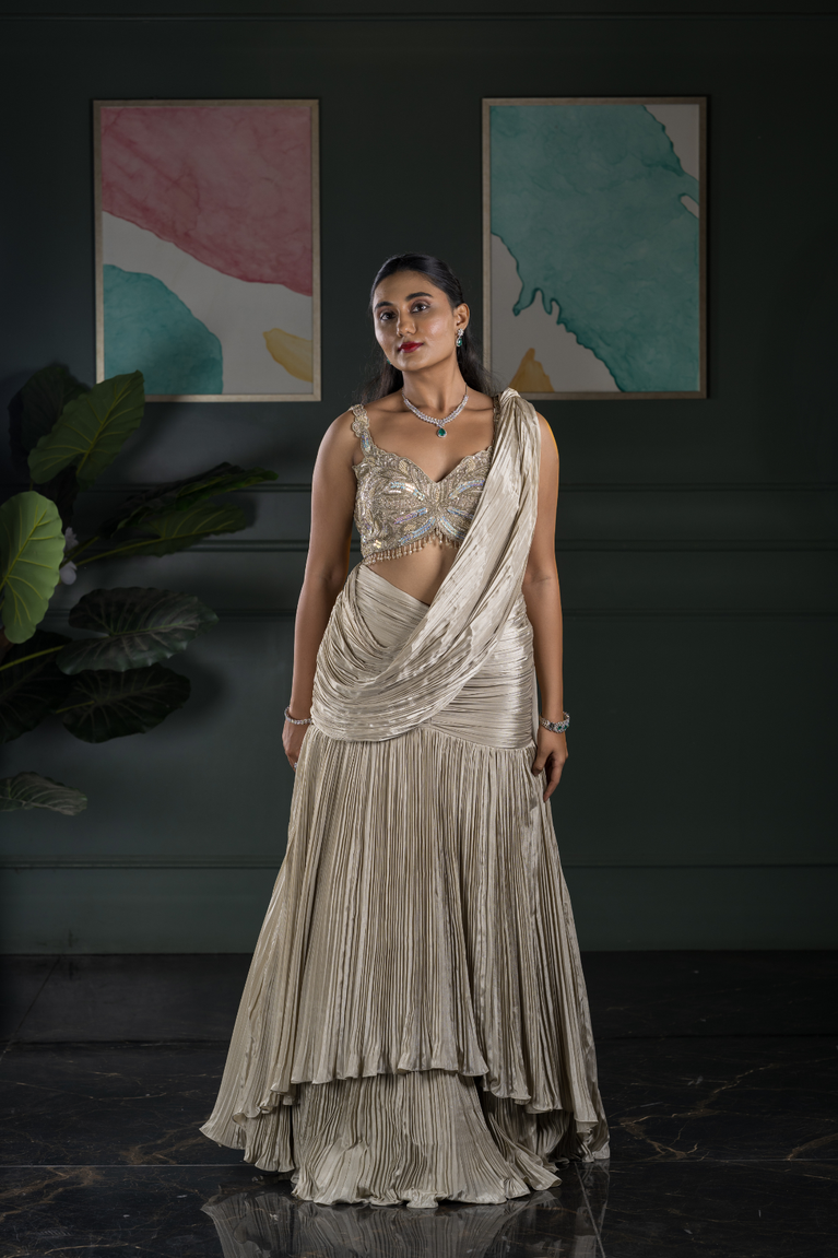 Featuring intricate zari detailing, this party wear gowns is a perfect fit for weddings, receptions, or festive evenings.