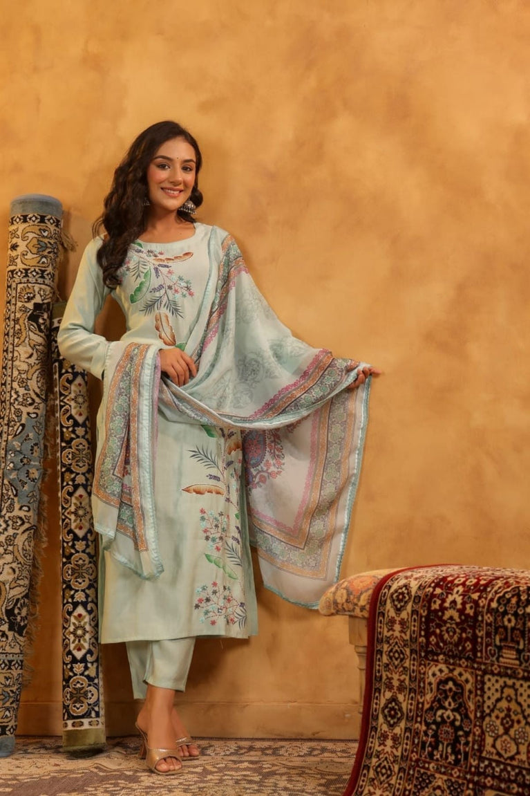 Mustard Organza Saree with Mint-Blue Pearl Work Blouse & Digital Print