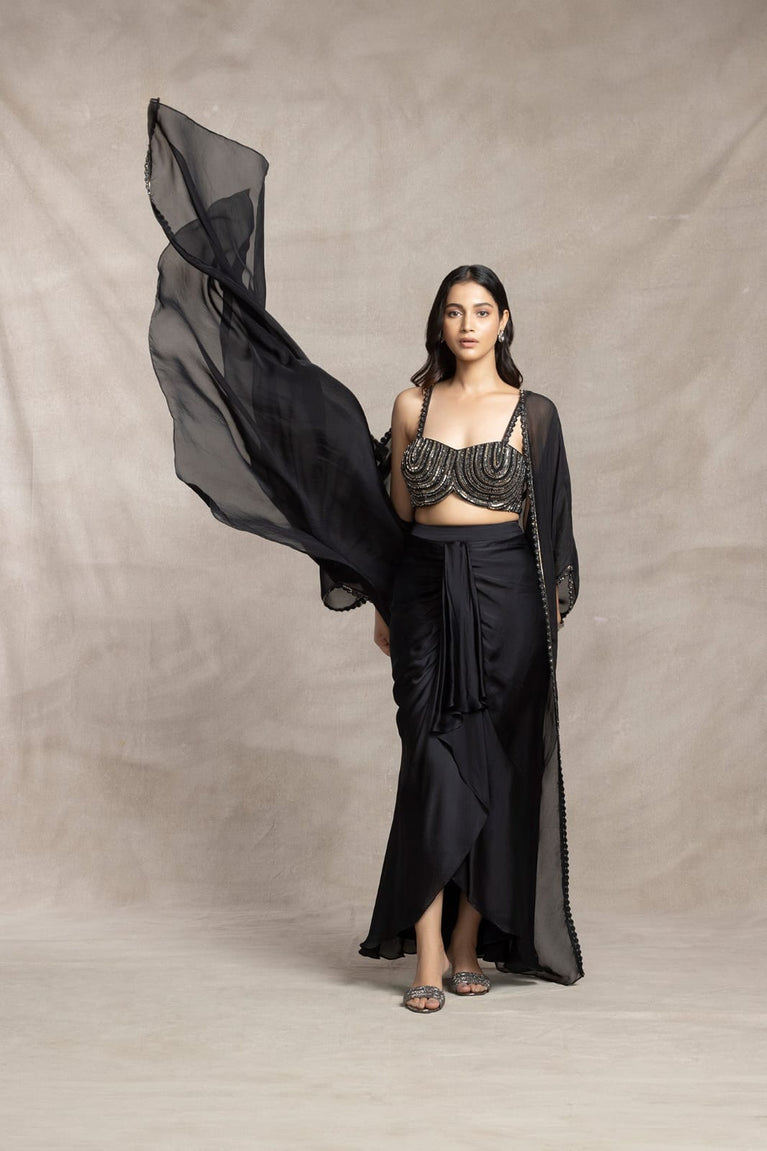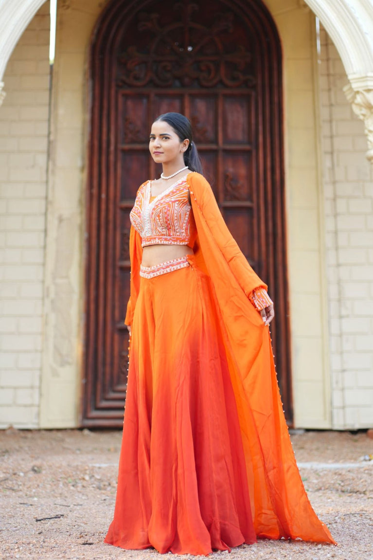 This vibrant orange coord set includes a fitted blouse, flared pants, and a flowy cape, giving a chic Indo-western look. A great pick for haldi ceremonies, cocktail parties, or fusion-themed weddings.