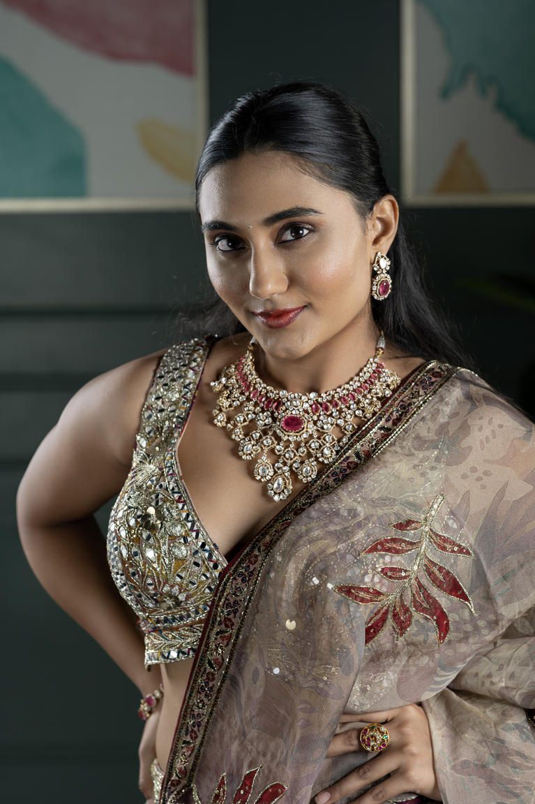 Turn heads with this rose gold soft organza saree, featuring a graceful border and a striking contrast pendant detail. Lightweight yet luxurious, it’s perfect for festive events and elegant gatherings. A blend of modern charm and classic style.