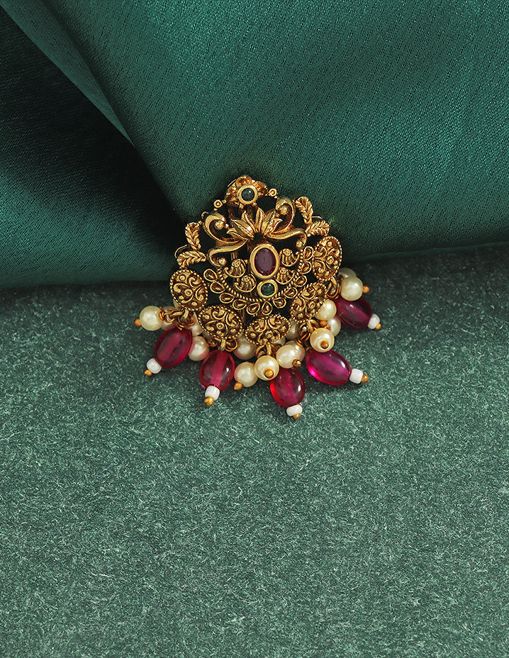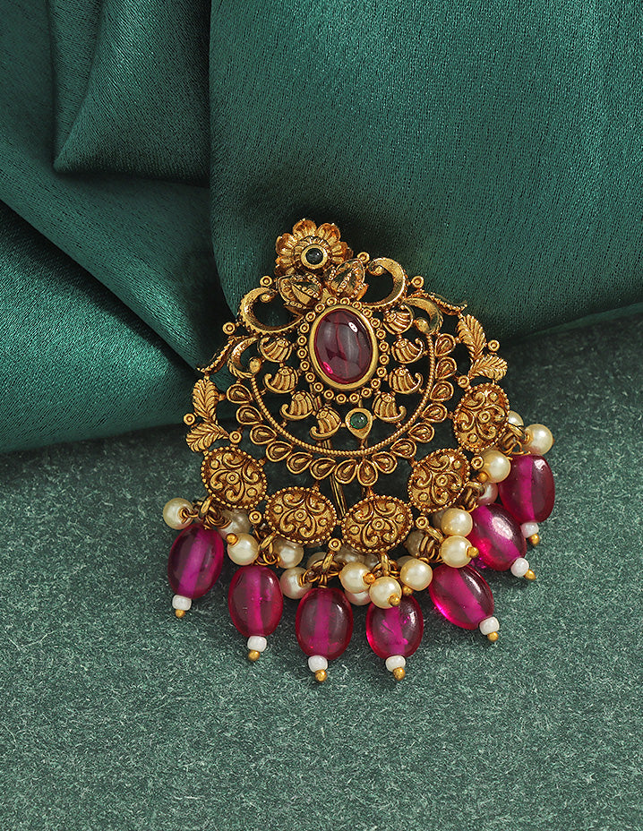 A majestic temple-style Choti Piece featuring an ornate gold finish, centered ruby stone, intricate motifs, and rich danglings of pearls and ruby beads—perfect for traditional grandeur.