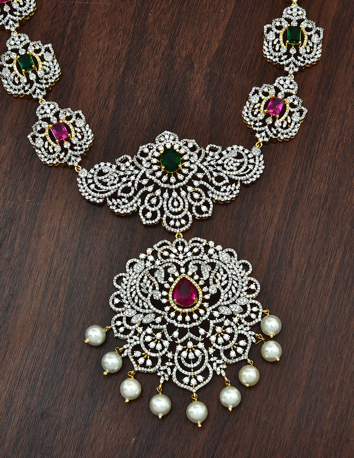 Looking for some stylish jewelry to pair with your regal silk saree? This majestic zircon long haaram set is the perfect pick for you. The magnificent design of the necklace combined with embedded white American diamonds looks flawless. The gold finish clearly doubles up the beauty of the haar set!