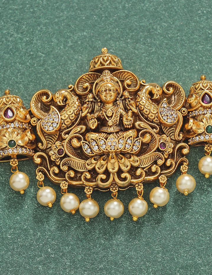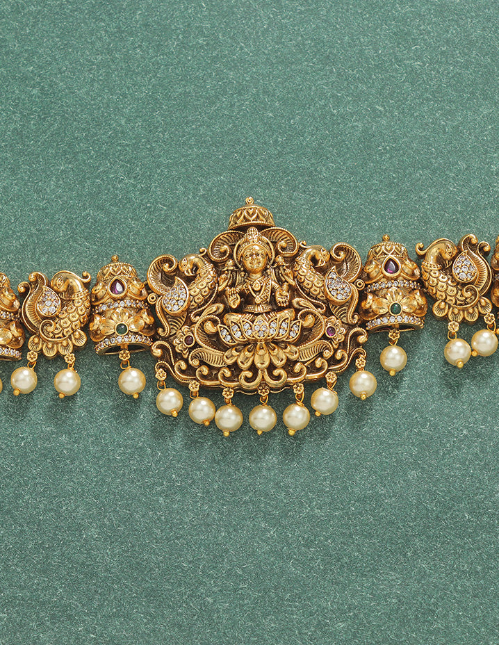 The Designer Matt Lakshmi Devi Chain Vaddanam appeals to customers who value intricate zirconia detailing and traditional elegance. It meets the demand for ornate, culturally significant jewelry with a modern designer finish.