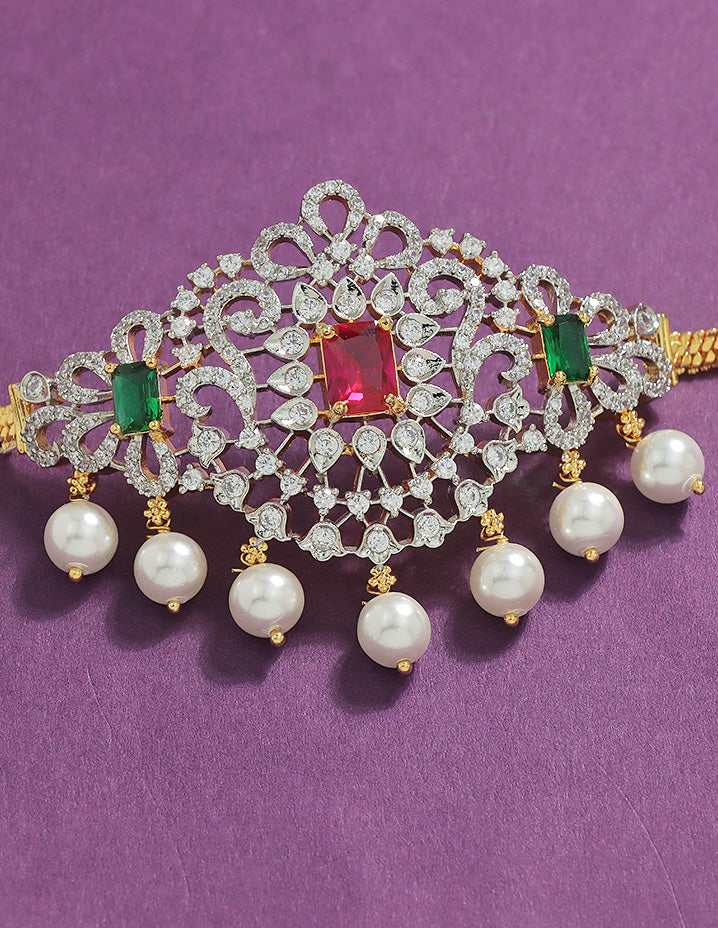Elevate your style with this Designer Zirconia Chain Bajuband, featuring a GJ Polish Ruby,Emerald and white design that adds elegance and durability with a stunning sparkle.