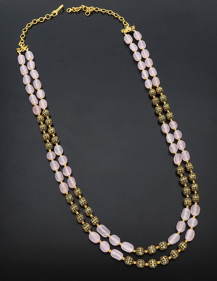 This Beautiful Designer 2-lines Monalisa Light Pink Beads Mala is made of the highest quality metalwork and embroidered adding the gold beads in middle. It's perfect for any traditional occasion and makes a bold style statement with its eye-catching desi looks.