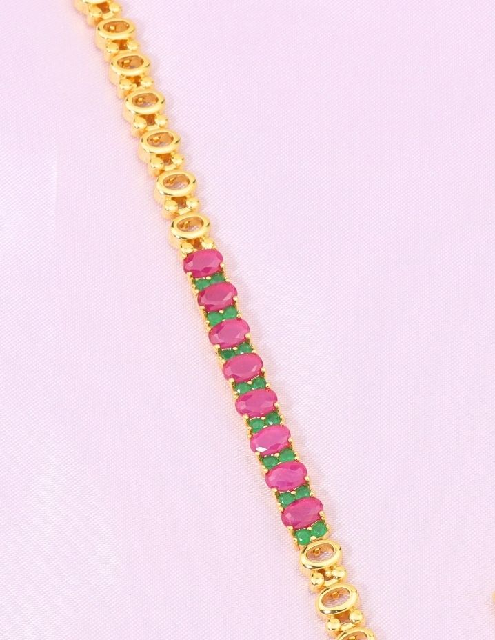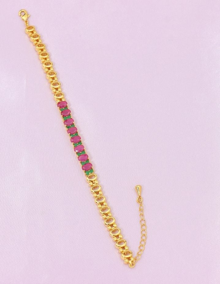 Elegant gold-plated chain bracelet adorned with sparkling Ruby & Emerald stones. Perfect for festive vibes or party nights—style that stands out effortlessly!