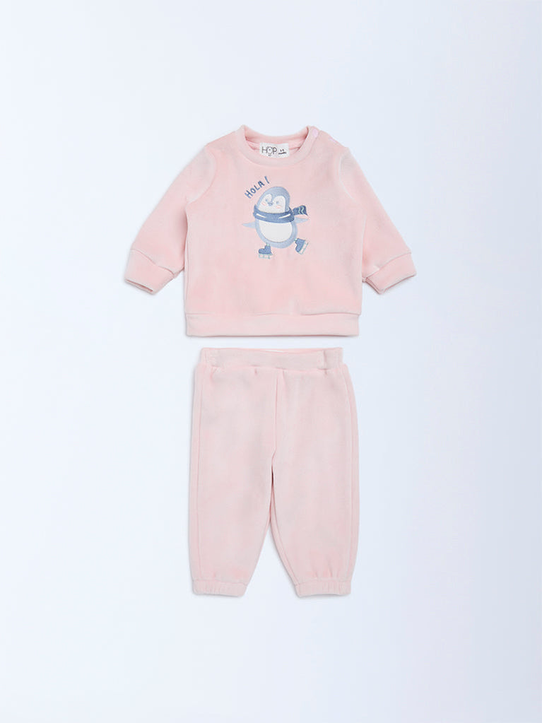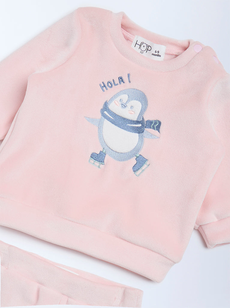 HOP Baby introduces this pink set, designed to keep little ones cosy through the day. The Sweatshirt features a sweet embroidered penguin motif for a playful touch and is styled with a crew neck and full sleeves. The matching pants come with an elasticated waist and cuffed hems to ensure a comfortable, secure fit. Made from a soft, breathable fabric blend, this set is a warm and charming pick for everyday wear.