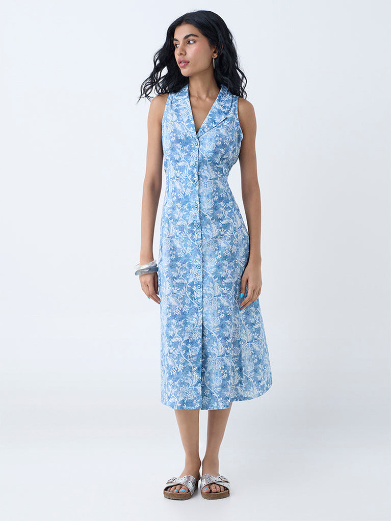 Bombay Paisley Blue Foliage Pattern Cotton Shirt Dress