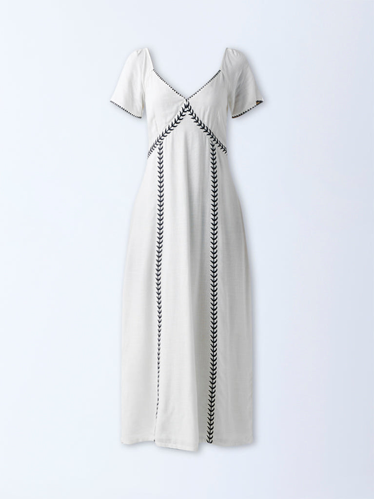 Bring a touch of nature-inspired elegance to your wardrobe with this white dress from Bombay Paisley. Accented with leaf embroidery, it’s made from quality fabric and features a flattering plunge neck and short sleeves.