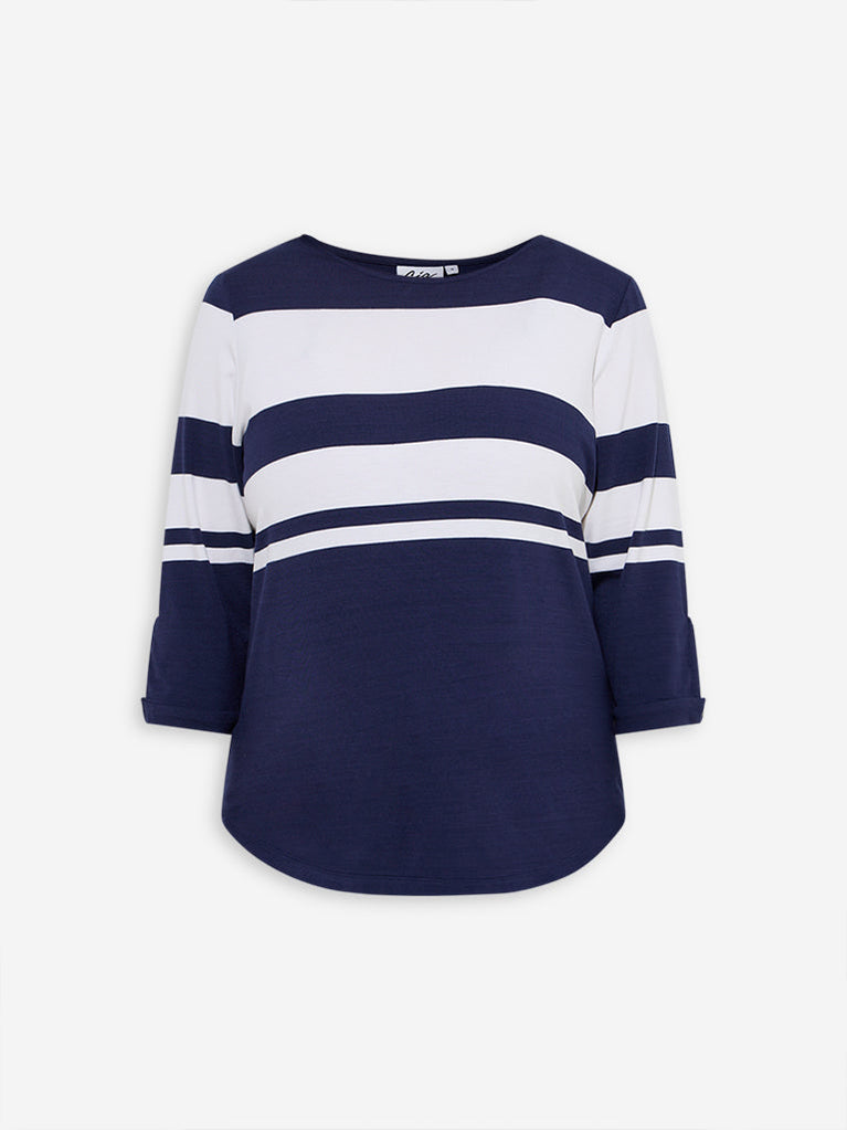 This blue and off-white striped shirt from Gia is crafted from a soft, lightweight fabric for effortless everyday wear. Designed with a classic round neckline and three-quarter sleeves, it brings a subtle touch of elegance to a timeless silhouette. Easy to style, it pairs seamlessly with jeans, trousers or skirts for relaxed yet polished looks.