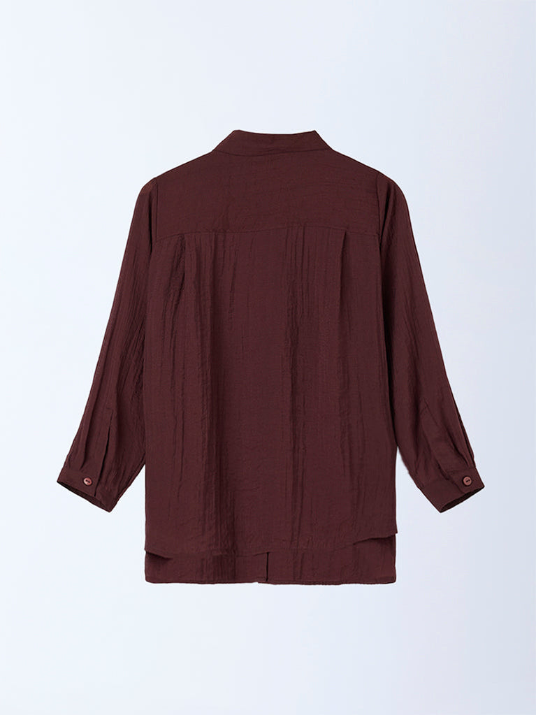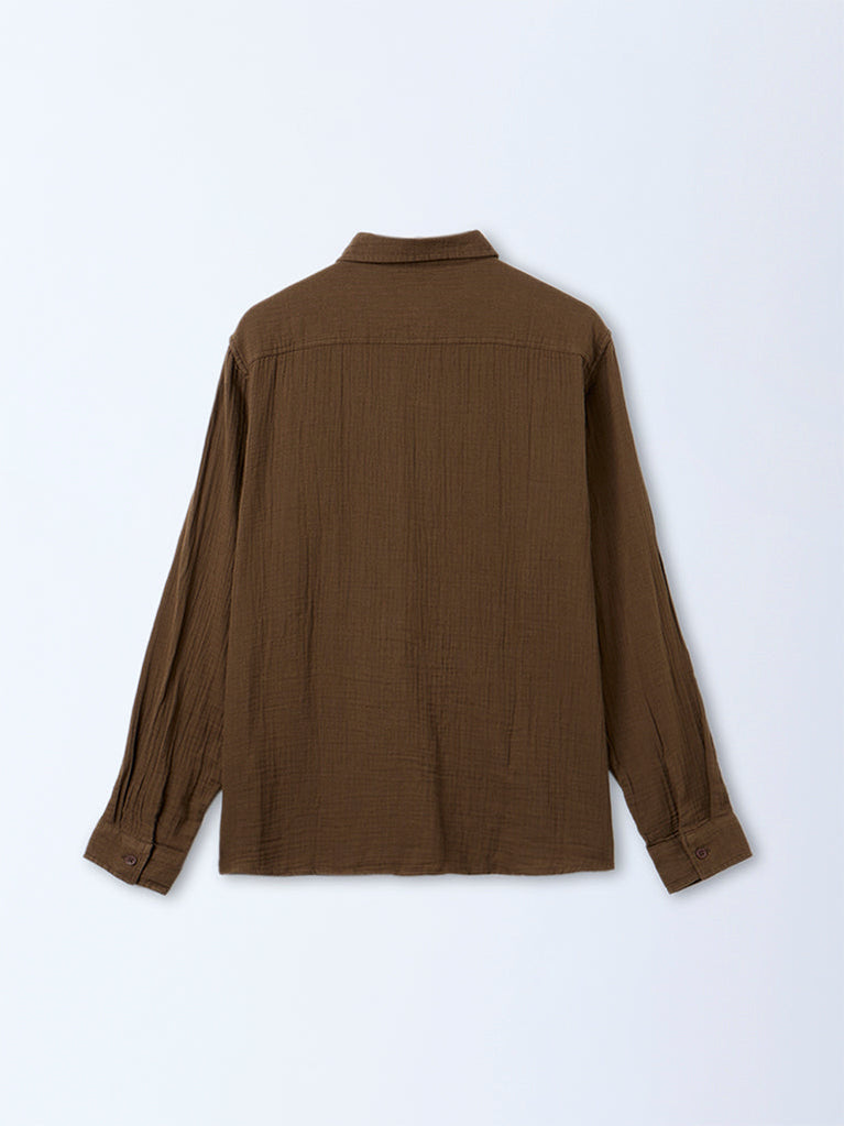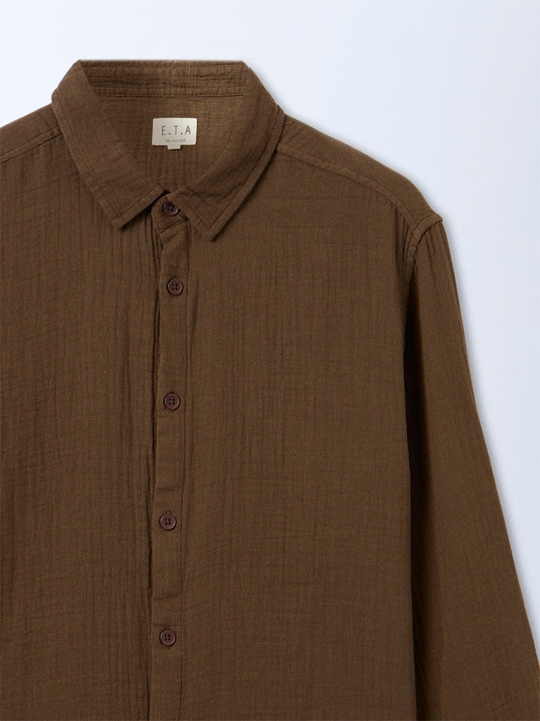 This dark brown crinkle-textured shirt from ETA is crafted from pure cotton for an elevated, breathable feel. Styled with a structured classic collar and full-length sleeves, it is accented with sleek metallic buttons that enhance its refined look. Versatile and understated, it pairs effortlessly with smart-casual separates for polished everyday dressing.