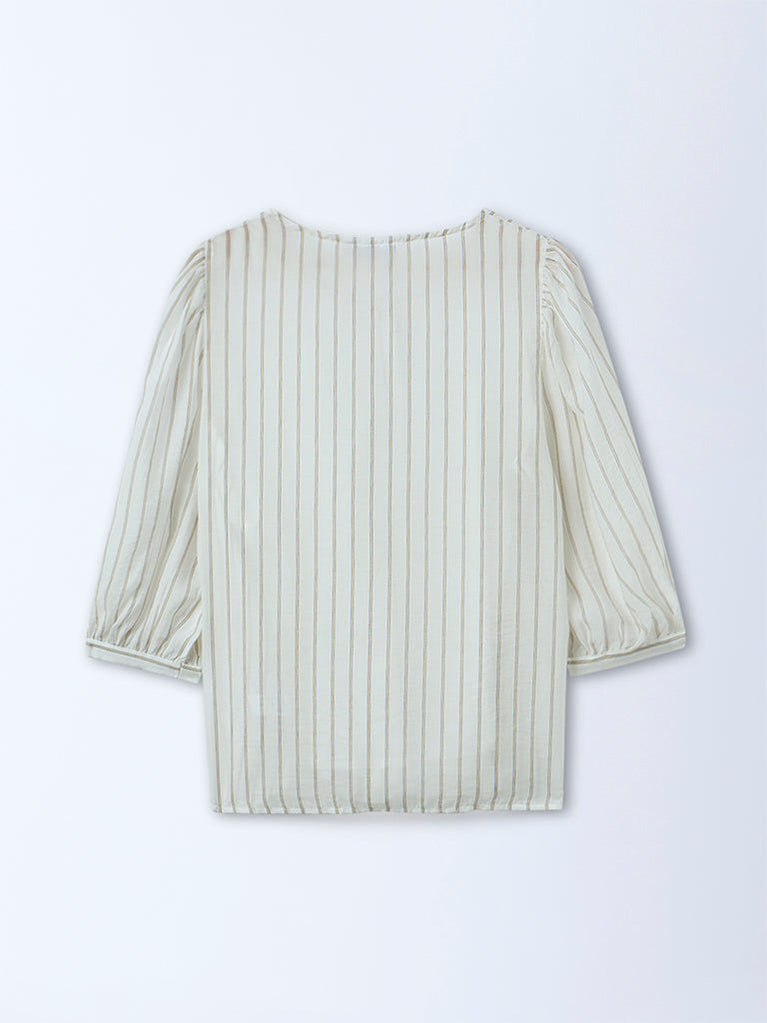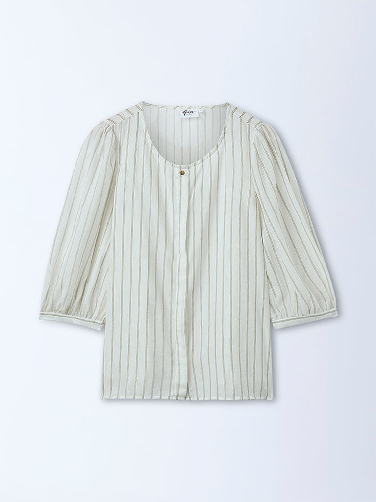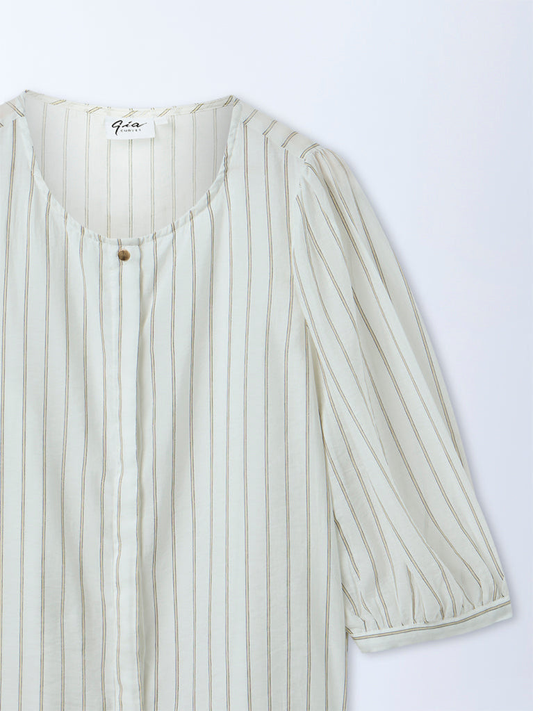 This white striped top by Gia is made from premium lightweight fabric, offering a breezy, comfortable feel. Styled with a classic round neckline, it features three-quarter puffed sleeves that lend gentle volume. Finished with a concealed button placket for a neat look, it transitions effortlessly from casual days to refined everyday ensembles.