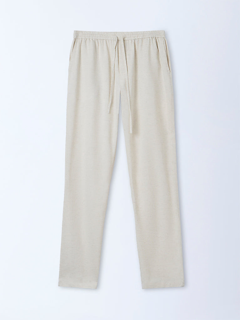 These off-white pants from Bombay Paisley redefine everyday dressing. Crafted for comfort with side pockets and an elasticated waistband featuring a button-zip fly, they’re finished with a braided leather belt that adds a touch of earthy sophistication.