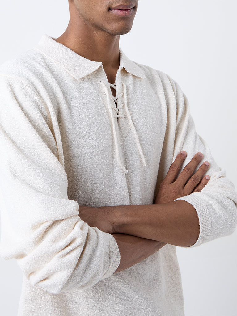 Designed for slow weekends and subtle style moments, this off-white ETA sweater is crafted from a lightweight textured fabric that feels effortless yet considered. The collar flows into criss-cross detailing for a modern twist, while the relaxed silhouette and full sleeves deliver throw-on ease for cooler days.