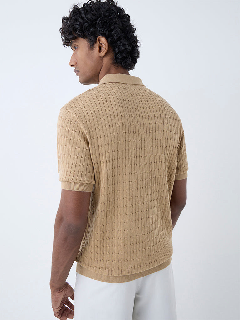 Ascot Beige Cable-Knit Relaxed-Fit Cotton Polo T-Shirt