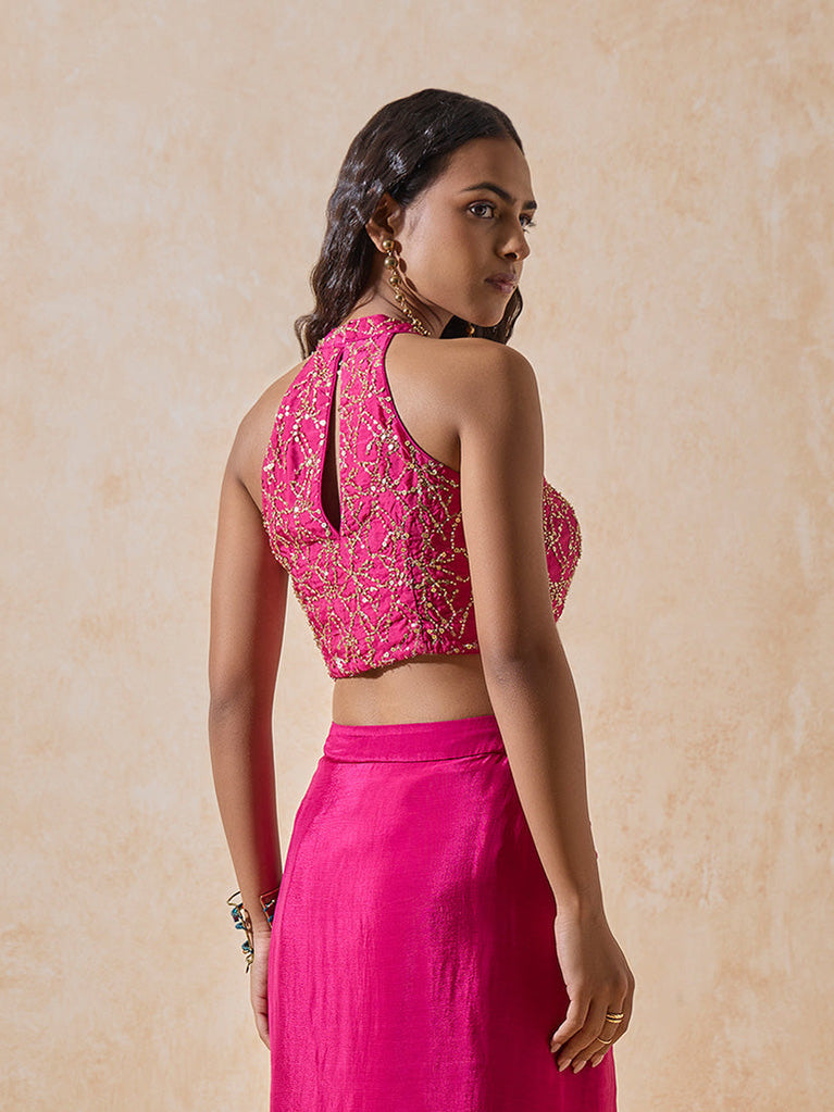 Perfect for pairing with festive ensembles, this pink blouse adds a refined touch to maxi skirts, lehengas or even saris. Crafted with a flattering square neck and short sleeves, the cropped silhouette is intricately embellished with delicate floral beadwork that lends subtle shimmer. The tie-up feature at the back, finished with playful pom-pom detailing, adds a charming flourish that beautifully balances tradition with modern femininity.