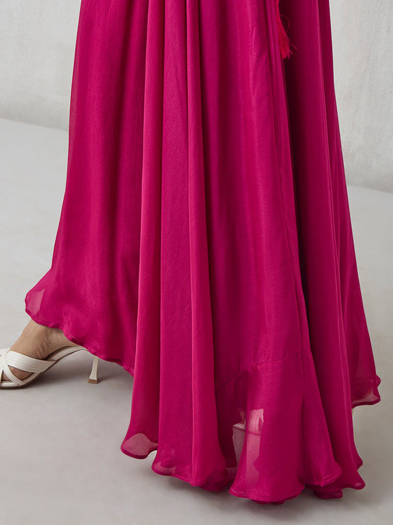 Presented in a vibrant pink shade, these palazzos are cut in an airy wide-leg silhouette for added stylishness. Featuring a slit pocket and a tie-up drawstring waist for a practical fit. You can effortlessly pair it with shirts and sandals for a look that takes you through formal celebrations and evening gatherings.