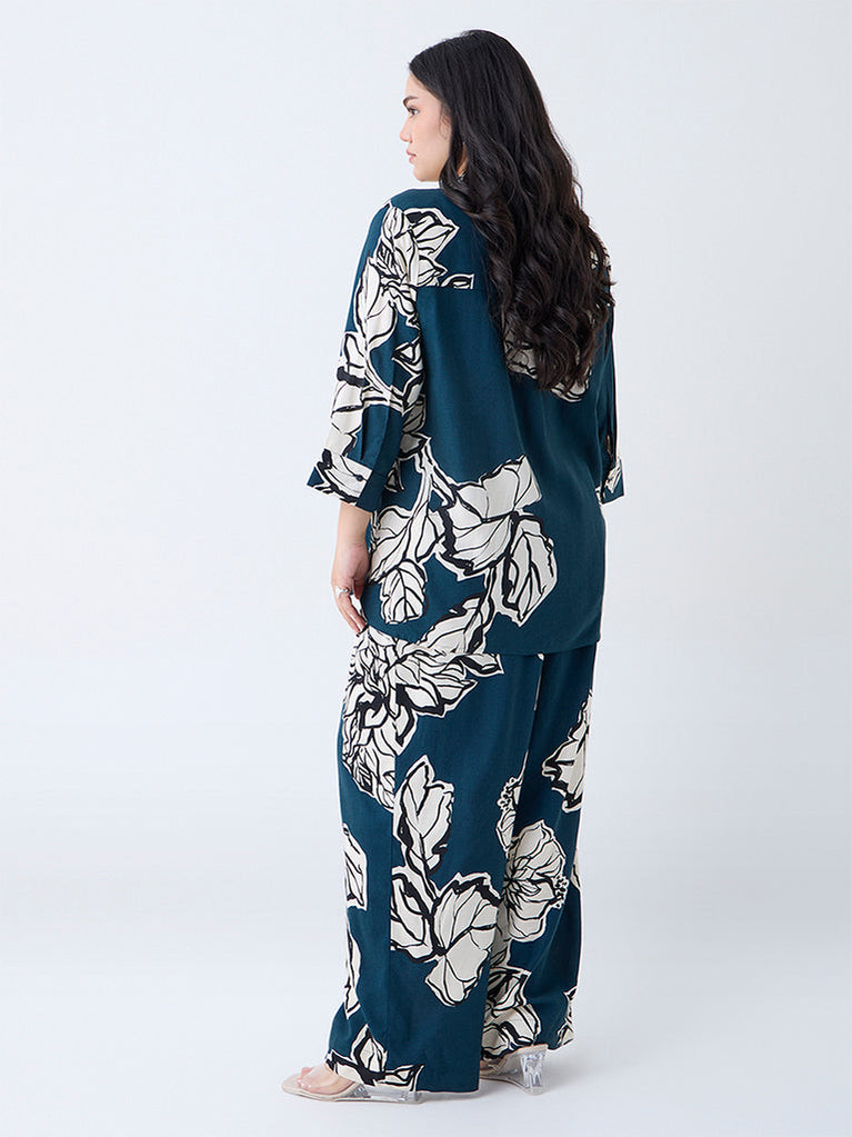 The teal shirt by Gia is adorned with foliage motifs that lend a sophisticated, nature-inspired touch. Milled from a sumptuous, fluid fabric, it features a classic collar and button placket that frame the neckline beautifully. three-quarter sleeves add graceful coverage, creating a flattering silhouette that pairs effortlessly with wide-leg trousers, denims, or co-ords.