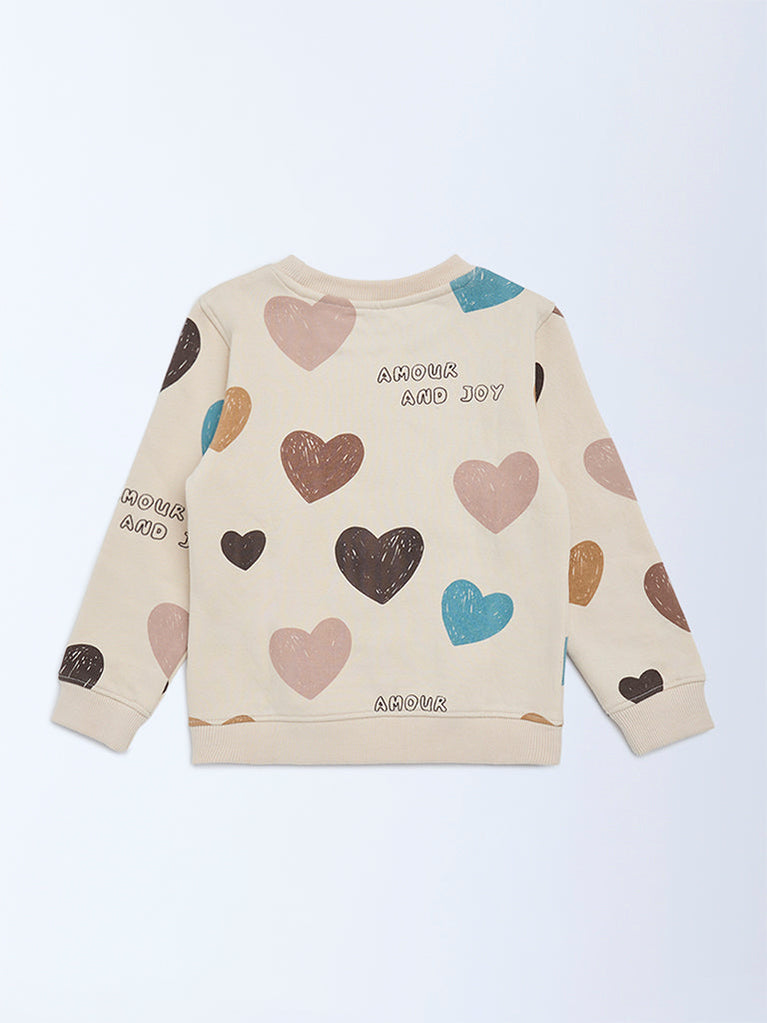 HOP Kids Beige Heart Printed Cotton-Blend Sweatshirt