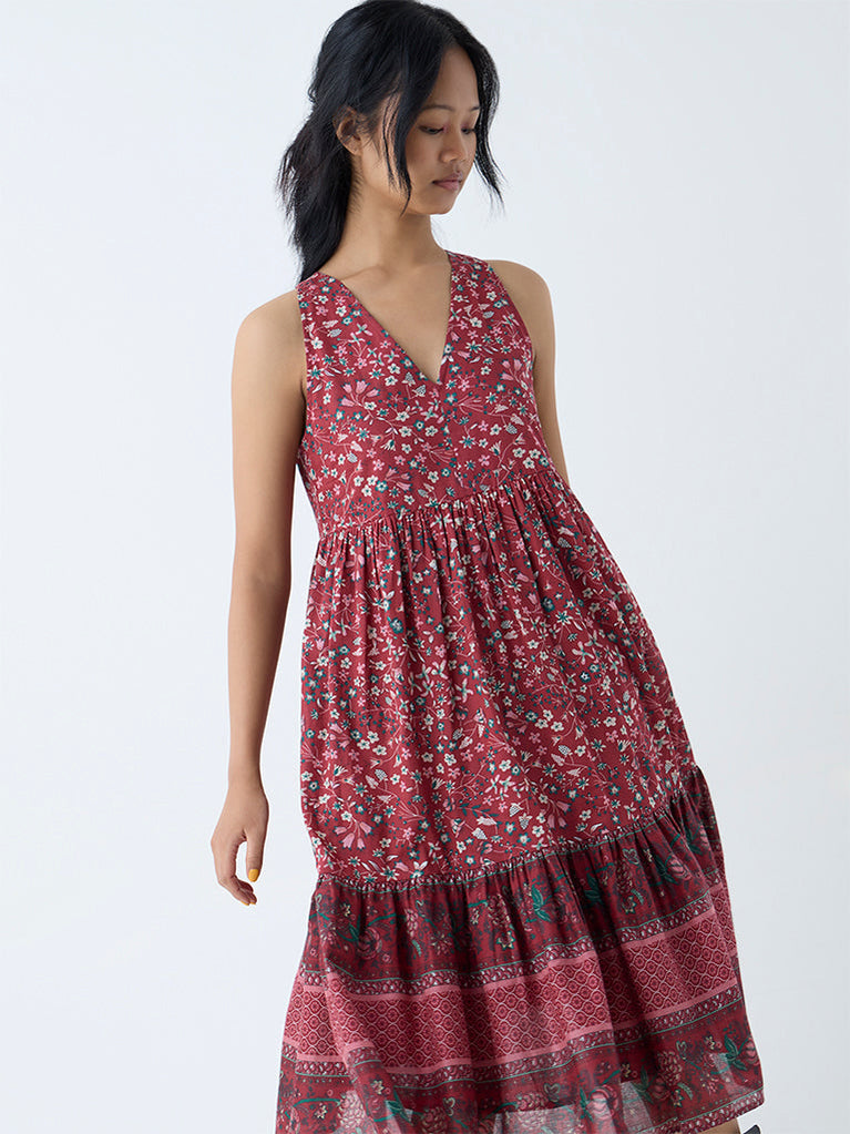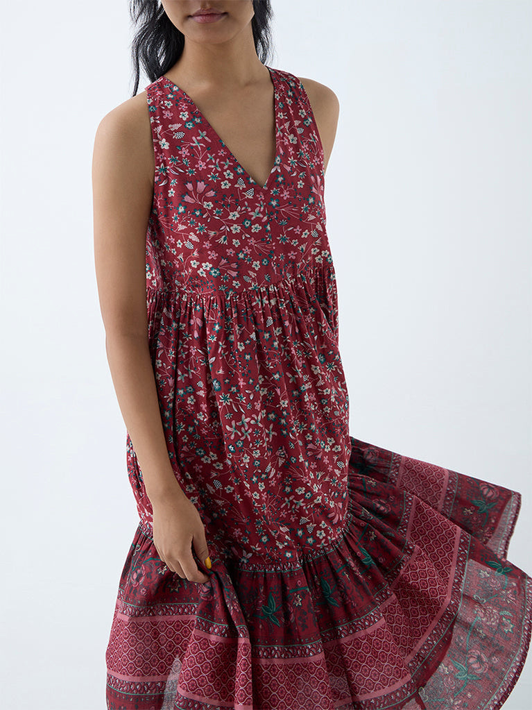 Bombay Paisley Maroon Floral Pattern Cotton Tiered Dress